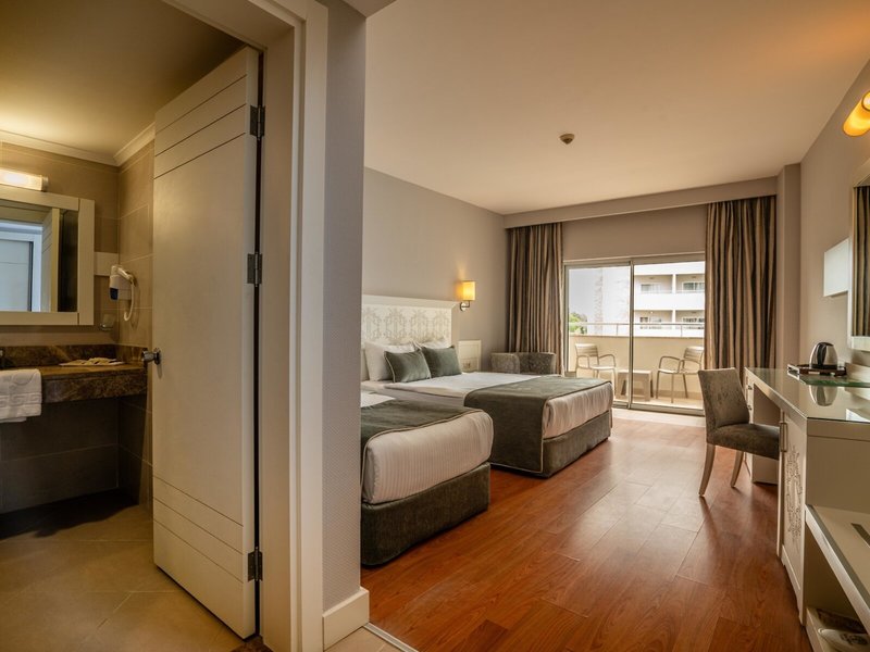 - Family Room Typ B (FZM2), Familienzimmer, Nichtraucherzimmer, im Hauptgebäude, Meerseite, Meerblick, Poolblick, ca. 42 m², bestehend aus 2 Zimmern, optisch getrennt durch Schiebetür, 2 Schlafzimmer, 2 Einzelbetten, 1 Doppelbett, Babybett: ohne Gebühr, bei All Inclusive inklusive, Anfrage notwendig, Reservierung nicht notwendig, Klimaanlage: ohne Gebühr, bei All Inclusive inklusive, April - Oktober, zentral gesteuert, Fußboden: Laminat, Safe: Barzahlung, pro Tag ca. 1.50 EUR, Minibar: ohne Gebühr, bei All Inclusive inklusive, Softdrinks: ohne Gebühr, bei All Inclusive inklusive, Wasser: ohne Gebühr, bei All Inclusive inklusive, Minibarauffüllung: täglich, Telefon, Internet: WLAN/WiFi: Barzahlung, pro Woche ca. 15 EUR, Fernseher: Flatscreen, im Schlafzimmer, deutsches Programm, Sat-TV, Roomservice: gegen Gebühr, Barzahlung, Badewanne oder Dusche, WC, Bademantel: gegen Gebühr, Barzahlung, Slipper: gegen Gebühr, Barzahlung, Föhn, Balkon: mit Sitzgelegenheit