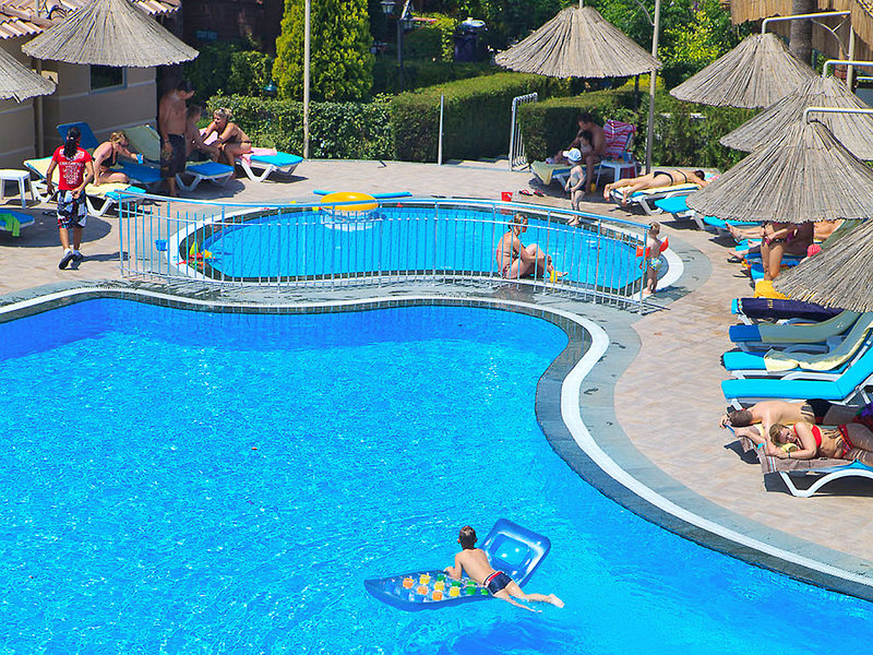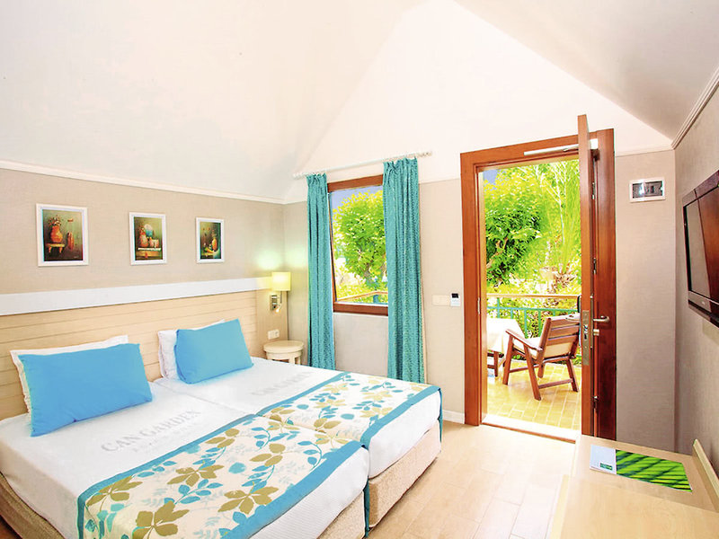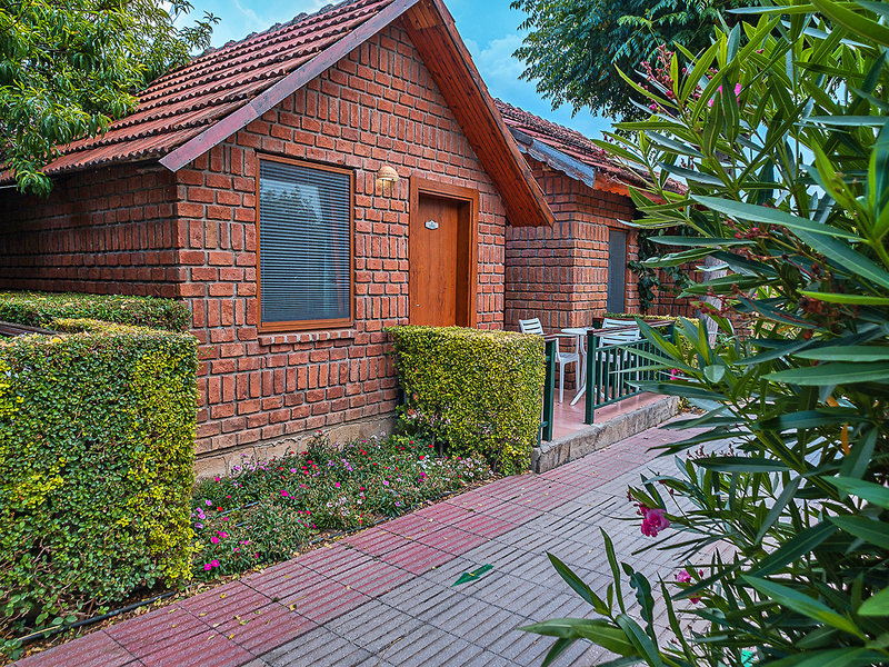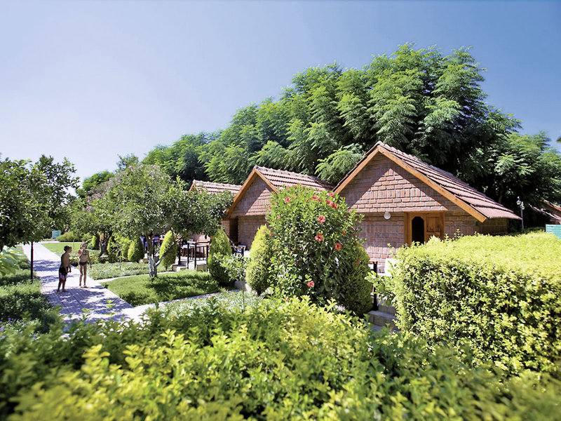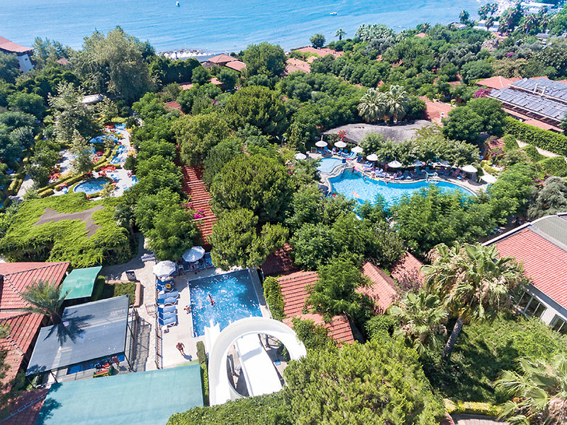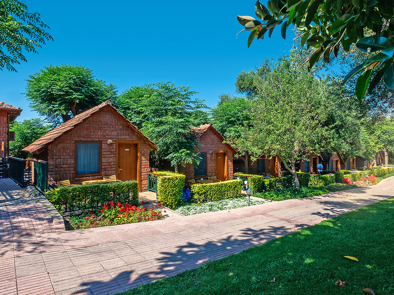 Ausstattung: Inmitten eines üppig bewachsenen Gartens gelegene, beliebte Ferienanlage der guten Mittelklasse mit mehreren Reihen- und Einzelbungalows. Swimmingpool, Rutschenpool, Sonnenterrasse. Liegen, Schirme, Auflagen, Badetücher am Pool. Pool-/Snackbar, Strandbar. Empfangshalle mit Rezeption, Lobbybar. WLAN in der gesamten Anlage inklusive. Fernsehraum, Leseraum, klimatisiertes Restaurant mit Terrasse, 2 À-la-carte-Restaurants (türkisch, Fischspezialitäten; gegen Gebühr, wetterabhängig vom 15.05.-01.10.). Bars, Patisserie, Minimarkt, Friseur. Landeskategorie: 4 Sterne, 208 Zimmer in ebenerdigen Bungalows.