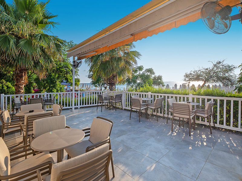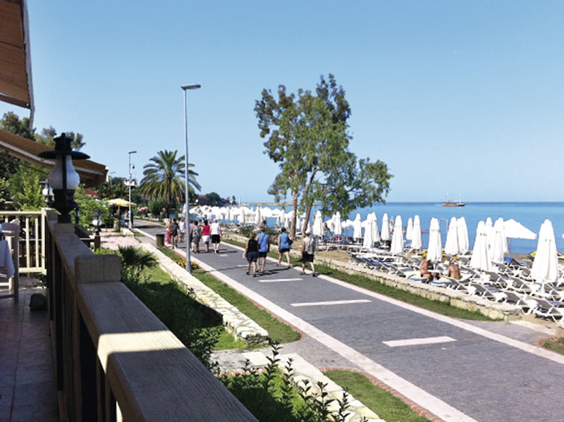 Poloha: Od dlhej piesočnatej pláže (s kamienkami) je oddelená plážovou promenádou so súkromnou kúpacou plošinou. V mori pri vodnej hladine sa nachádzajú pozostatky starovekého prístavu. Centrum historického prístavného mesta Side s množstvom nákupných a zábavných možností je ľahko dostupné pešo po plážovej promenáde (cca 500 m).