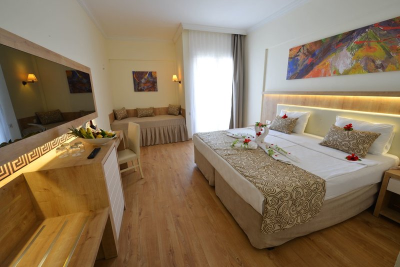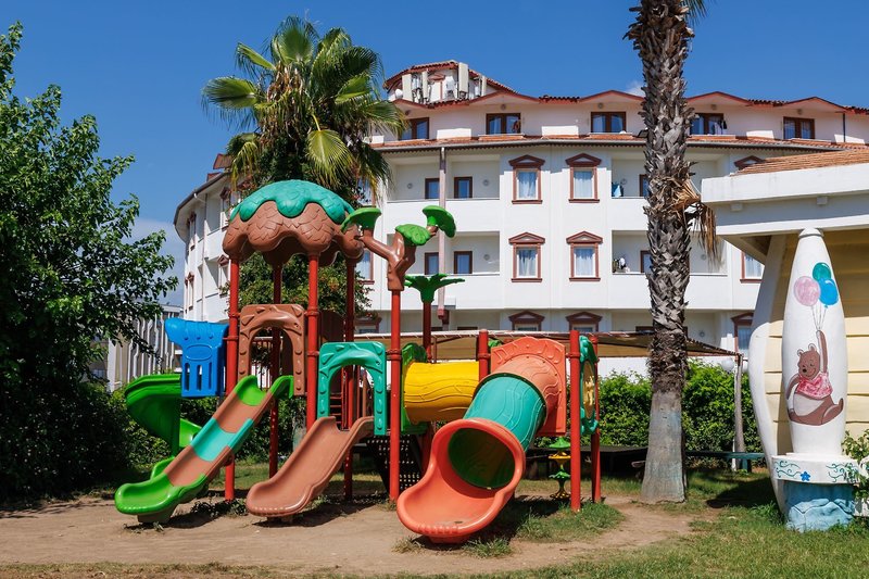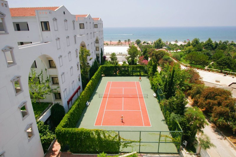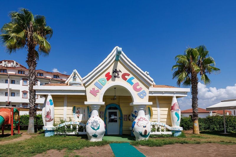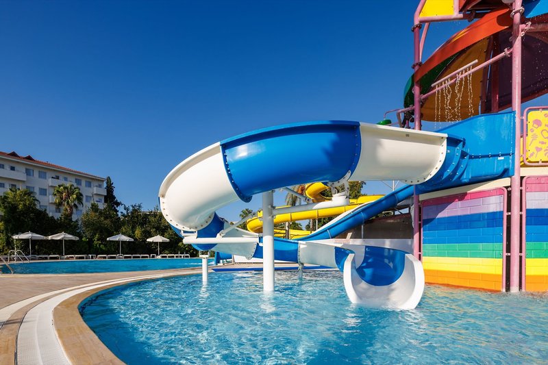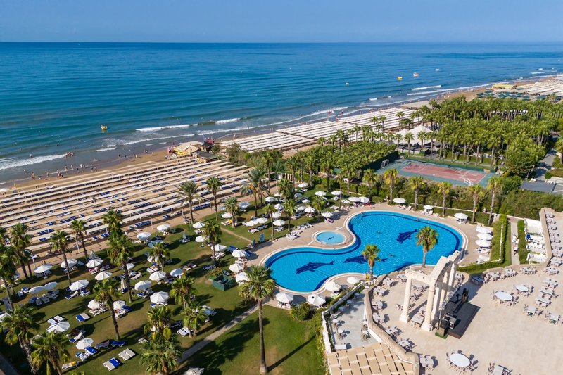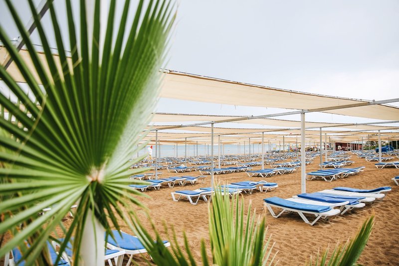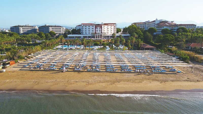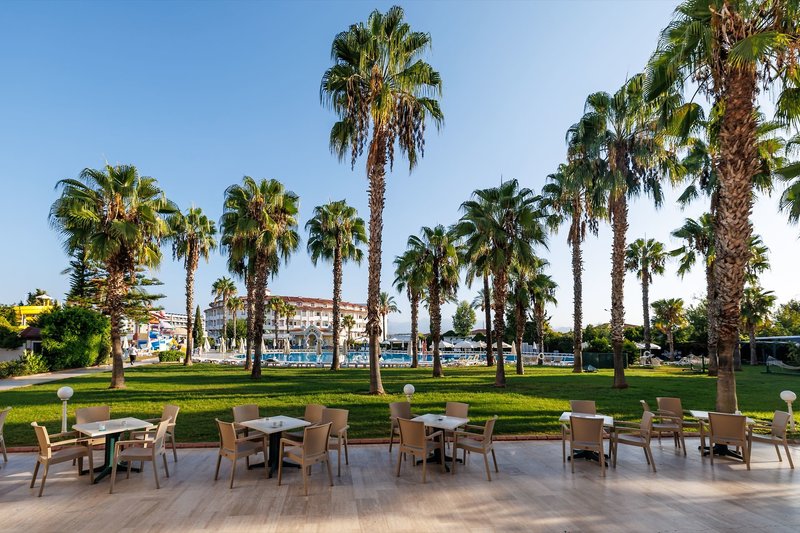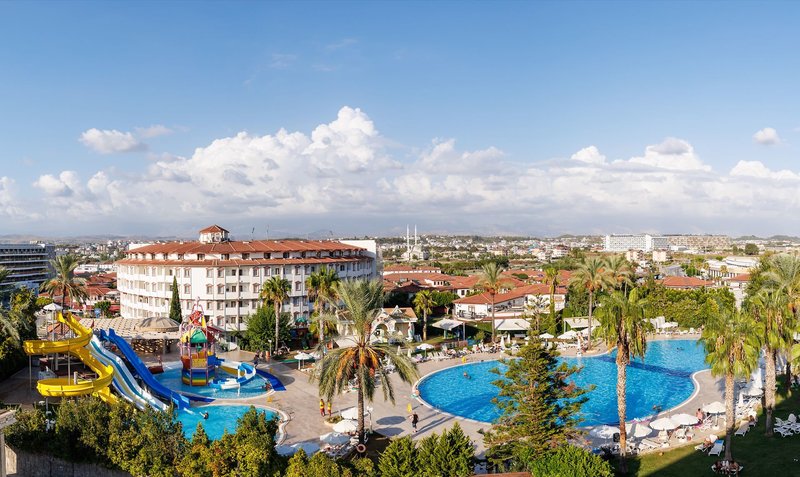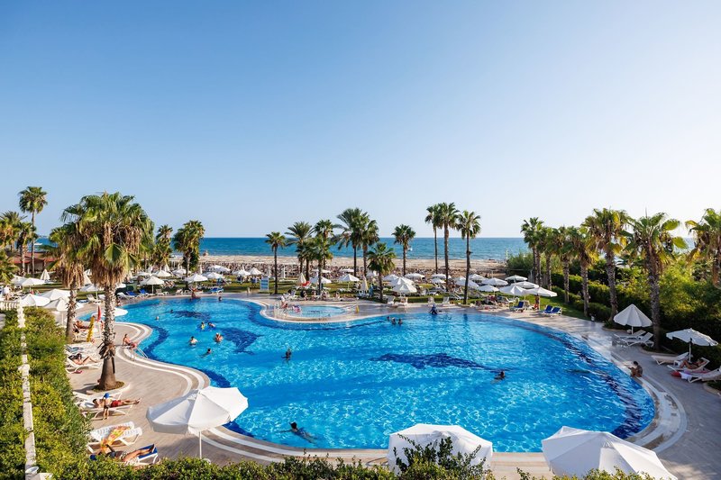 Ausstattung: Die gepflegte Hotelanlage, mit insgesamt 671 Zimmern, besteht aus einem fünfstöckigen Haupthaus mit mehreren Lifts und einem Nebengebäude, auch fünfstöckig und mit Lifts. Ihr Hotel verfügt über eine geschmackvoll gestaltete Empfangshalle mit Rezeption und Sitzecken, Buffetrestaurant, mehrere Bars, Diskothek, diverse À-la-carte-Restaurants (sechs Tage die Woche, vom 15.6. bis 15.9. geöffnet, einmal pro Woche eins mit Voranmeldung und nach Verfügbarkeit inklusive), eine À-la-Carte Snackbar (21:30-7 Uhr geöffnet und inklusive), TV-Raum, Diskothek, Hallenbad und gegen Gebühr verschiedene Geschäfte und Friseur. Wi-Fi ist in der gesamten Anlage inklusive. Im weitläufigen Garten befinden sich ein Süßwasser-Swimmingpool mit Kinderbecken und Wasserrutschen für Kinder, drei Wasserrutschen für Erwachsene und am Strand befindet sich ein Relaxepool und ein separates Kinderbecken für Kinder mit Sonnenterrassen, Liegen, Sonnenschirme und Badetücher (einmal am Tag inklusive).