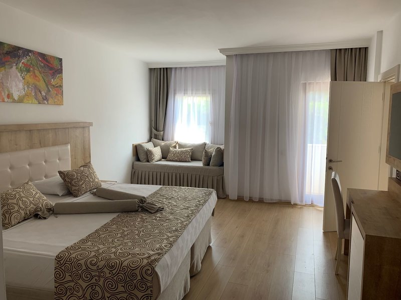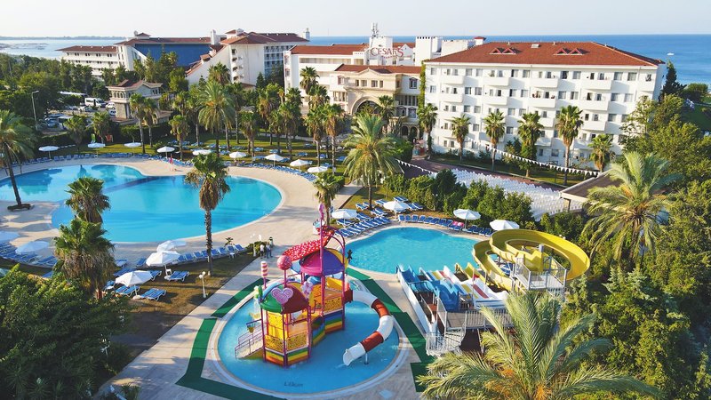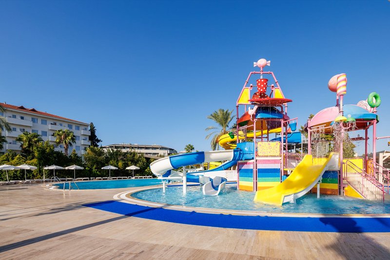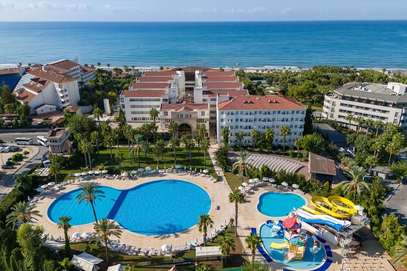 Ausstattung: Die gepflegte Hotelanlage, mit insgesamt 671 Zimmern, besteht aus einem fünfstöckigen Haupthaus mit mehreren Lifts und einem Nebengebäude, auch fünfstöckig und mit Lifts. Ihr Hotel verfügt über eine geschmackvoll gestaltete Empfangshalle mit Rezeption und Sitzecken, Buffetrestaurant, mehrere Bars, Diskothek, diverse À-la-carte-Restaurants (sechs Tage die Woche, vom 15.6. bis 15.9. geöffnet, einmal pro Woche eins mit Voranmeldung und nach Verfügbarkeit inklusive), eine À-la-Carte Snackbar (21:30-7 Uhr geöffnet und inklusive), TV-Raum, Diskothek, Hallenbad und gegen Gebühr verschiedene Geschäfte und Friseur. Wi-Fi ist in der gesamten Anlage inklusive. Im weitläufigen Garten befinden sich ein Süßwasser-Swimmingpool mit Kinderbecken und Wasserrutschen für Kinder, drei Wasserrutschen für Erwachsene und am Strand befindet sich ein Relaxepool und ein separates Kinderbecken für Kinder mit Sonnenterrassen, Liegen, Sonnenschirme und Badetücher (einmal am Tag inklusive).