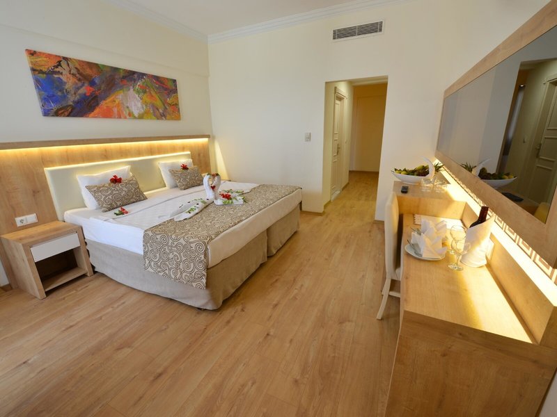 - Double Standard Sea View Room (DZM1), Doppelzimmer, im Hauptgebäude, Meerseite, Meerblick, seitlicher Meerblick, ca. 24 m², letzte Komplettrenovierung 2019, letzte Teilrenovierung 2020, Gesamtanzahl der Räume in diesem Zimmertyp: 1, Aufteilung wie folgt: kombiniertes Wohn-/Schlafzimmer, Babybett: ohne Gebühr, Anfrage & Reservierung nicht notwendig, Klimaanlage: ohne Gebühr, Mai - September; saisonabhängig; wetterabhängig, zentral gesteuert, kalt, Fußboden: Laminat, Safe: ohne Gebühr, Standventilator, Sofa, Minibar: ohne Gebühr, Softdrinks: ohne Gebühr, bei All Inclusive inklusive, Wasser: ohne Gebühr, Minibarauffüllung: mehrmals pro Woche, Telefon, Internet: WLAN/WiFi: ohne Gebühr, Fernseher: Flatscreen, im Schlafzimmer, Sat-TV, Reinigungsservice: mehrmals pro Woche, ohne Gebühr, Dusche, WC, Föhn, Balkon