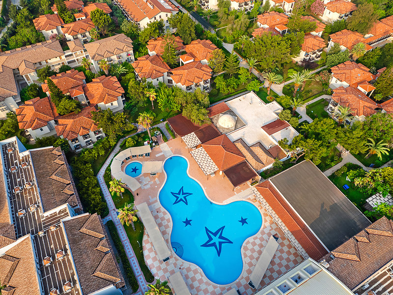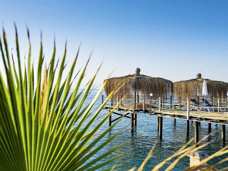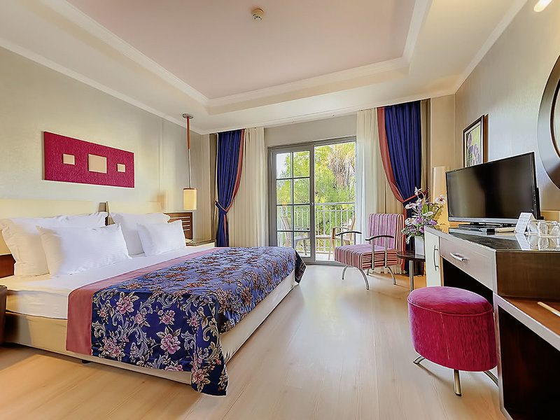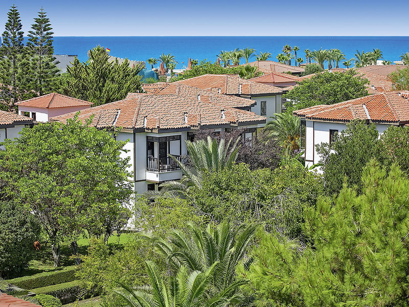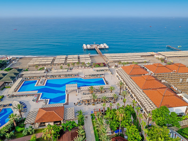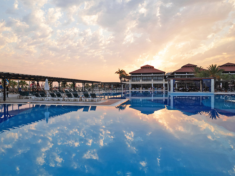 Ausstattung: Innerhalb der ca. 98.000 qm großen Grünanlage 3 Swimmingpools, 6 Rutschen (stdw.), Sonnenterrassen. Liegen, Schirme, Badetücher (1 Wechsel pro Tag). Pool-/Snackbar, Bar auf dem Badesteg am Strand (gegen Gebühr). Empfangshalle, Rezeption, Lobbybar, WLAN. Hauptrestaurant, 3 À-la-carte-Restaurants. Patisserie, mehrere Bars, Geschäfte, Disko, Friseur. Landeskategorie: 5 Sterne, 586 Zimmer, 1 Haupthaus/15 Bungalows, 2 Etagen.