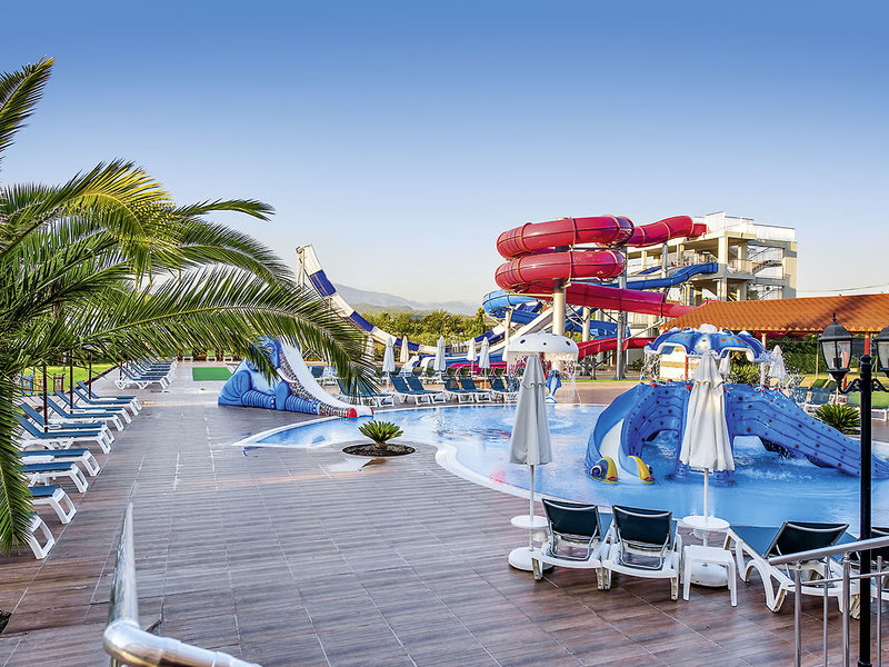 3 Kinderpools (teilweise überdacht), 3 Wasserrutschen (stdw.), Spielplatz, Kinderrestaurant, Babyecke (Flaschenwärmer etc.), separater Aquapark (6 Rutschen)