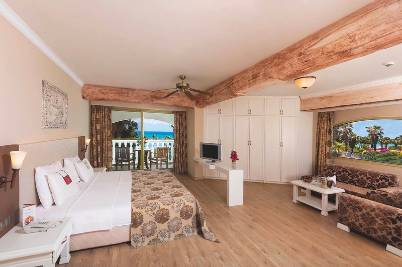 Ana Deluxe Zimmer (ca. 42 m² inkl. Bad): Die komfortabel eingerichteten Zimmer sind größer als die Ana Zimmer und verfügen über ein extra großes Doppelbett (Kingsize/220x200 cm, mit zwei getrennten Matratzen) Dusche/WC, Föhn, Safe, Wi-Fi, Sat LCD TV mit Musikkanal (mehrere deutsche Programme verfügbar), Klimaanlage (zentral gesteuert, stundenweise, wetterbedingt), Minikühlschrank, Direktwahl-Telefon, Laminatboden, Sitzecke und Balkon und haben seitlichen oder direkten Meerblick. Min. Belegung 3 Erwachsene (DDM).