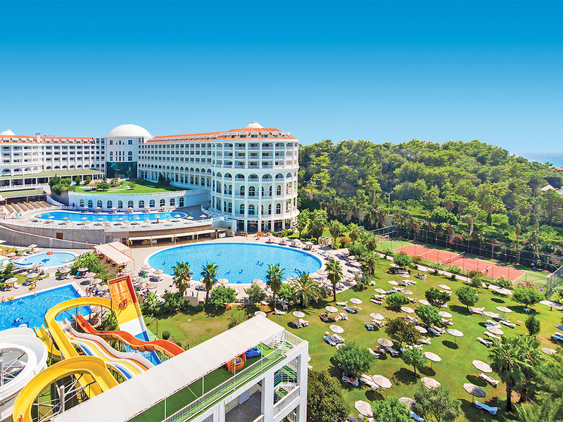 Vybavenie: Približne 25 000 m² dobre udržiavaného, priestranného areálu, bazénová plocha (cca 1 084 m²). Lehátka, vankúše, plážové osušky (na izbe) a slnečníky sú zahrnuté v cene hotelovej súkromnej pláže s malým bufetom s občerstvením. Aquapark (otvorený v určitých časoch, ak to počasie dovolí), bar pri bazéne. Lobby s recepciou, pohodlné posedenie, lobby bar, TV miestnosť s veľkou obrazovkou, Wi-Fi v záhrade a na pláži, lobby, bazénová a barová časť v cene, hlavná reštaurácia s medzinárodnou kuchyňou a terasa (nefajčiarska zóna), bary, lekár na požiadanie (v určitých časoch, za poplatok). Oficiálne hodnotenie: 4,5 hviezdičky, 282 izieb Defnem, 26 rodinných izieb Defnem, 10 luxusných rodinných izieb Defnem, 35 ekonomických izieb, 4 bezbariérové izby (na požiadanie), 4-5 poschodí, 4 panoramatické výťahy.