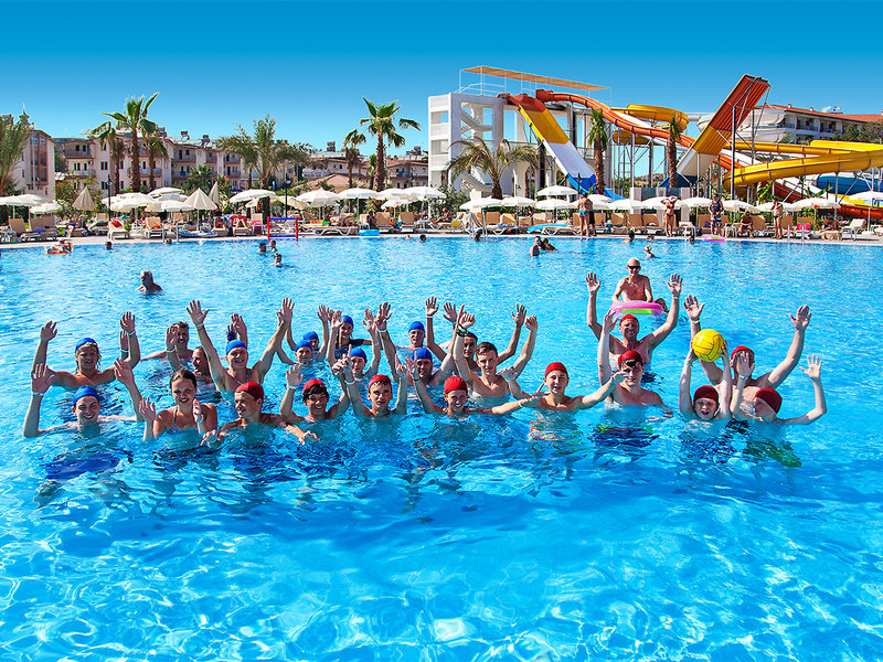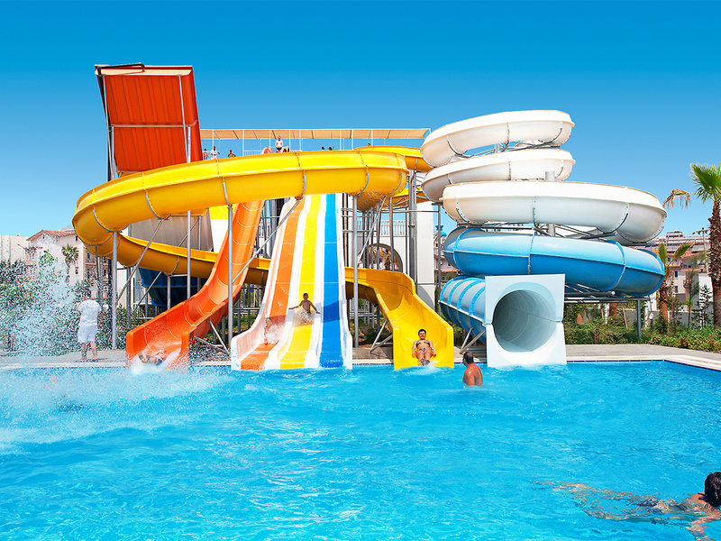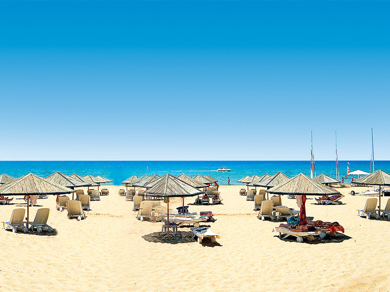 Ausstattung: Ca. 25.000 qm große, gepflegte, weitläufige Außenanlage, Swimmingpoollandschaft (ca. 1084 qm). Am hoteleigenen Strand mit kleinem Snackbuffet sind Liegen, Auflagen, Strandtücher (im Zimmer) und Sonnenschirme inklusive, Aquapark (stdw., wetterabh.), Poolbar. Empfangshalle mit Rezeption, gemütl. Sitzecke, Lobbybar, TV-Raum mit Großleinwand, WLAN im Garten und am Strand, Lobby-, Pool- und Barbereich inkl., Hauptrestaurant mit internationalen Gerichten mit Terrasse (Nichtraucherzone), Bars, Arztservice (stdw., geg. Geb.). Landeskat.: 4,5 Sterne, 282 Defnem Zimmer, 26 Defnem Familienzimmer, 10 Defnem Deluxe Familienzimmer, 35 Zimmer Type Economy, 4 Behindertenzimmer (auf Anfrage), 4-5 Etg., 4 Panoramalifte.