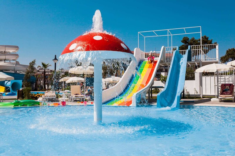 Vybavenie: Moderný komfortný hotel vám ponúka 282 izieb Defnem, 26 rodinných izieb Defnem, 10 rodinných izieb Defnem Deluxe, 35 izieb Economy a 4 bezbariérové izby (na vyžiadanie), ktoré sa rozprestierajú na približne 25 000 m² v niekoľkých prepojených štyroch až piatich -poschodové budovy (k dispozícii sú štyri panoramatické výťahy). V tomto pôvabnom hoteli vás privíta elegantná vstupná hala s recepciou, elegantným posedením a lobby barom. K ďalšiemu vybaveniu patrí hlavná reštaurácia s medzinárodnou kuchyňou s terasou (nefajčiarska časť), ďalšie bary a TV miestnosť s veľkoplošnou obrazovkou. Wi-Fi je zahrnuté v záhrade, na pláži, vo vstupnej hale, pri bazéne a v bare. V krásne vysadených záhradách nájdete plavecký bazén (1084 m²) so samostatným detským bazénom a atraktívny aquapark s niekoľkými skvelými toboganmi (v závislosti od počasia, každú hodinu). Tu a na vlastnej hotelovej pláži s malým občerstvením formou bufetu, ležadlami, vankúšmi, plážovými osuškami (na izbe) a slnečníkmi sú zahrnuté v cene.