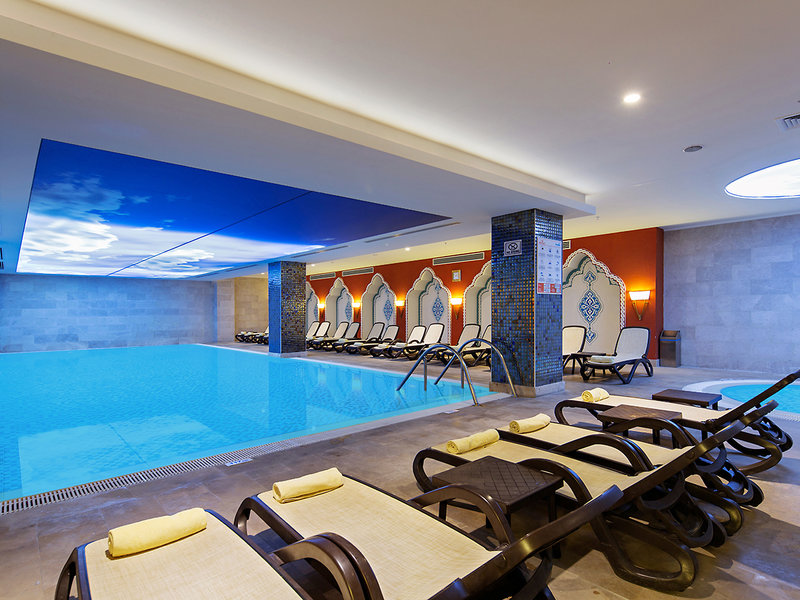 Freuen Sie sich auf den langen, direkt vor dem Hotel beginnenden Sandstrand und Ihre stilvoll eingerichtete Juniorsuite mit Jacuzzi und seitlichem Meerblick. Entspannung pur finden Sie nicht nur im traditionellen Hamam des 750 qm großen, luxuriösen Wellnesstempels.