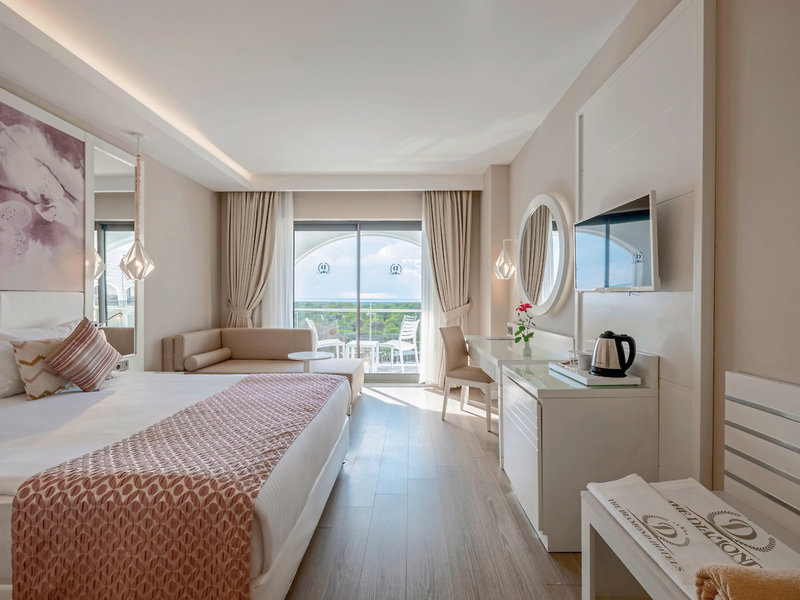 - Junior Suite, hlavná budova, výhľad na more, vizuálne oddelená obývacia izba/spálňa, posedenie, sprchovací kút, WC, fén, individuálne ovládateľná klimatizácia, minibar (pravidelne dopĺňaný), trezor, 1 TV (satelitná TV, plochá obrazovka), rýchlovarná kanvica, balkón