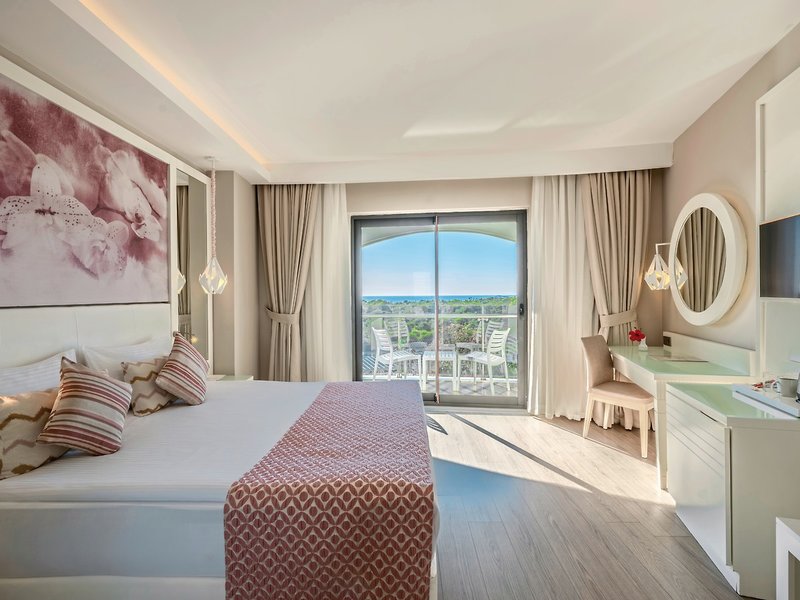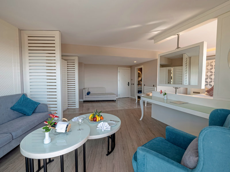 - Junior Suite, hlavná budova, výhľad na more, vizuálne oddelená obývacia izba/spálňa, posedenie, sprchovací kút, WC, fén, individuálne ovládateľná klimatizácia, minibar (pravidelne dopĺňaný), trezor, 1 TV (satelitná TV, plochá obrazovka), rýchlovarná kanvica, balkón