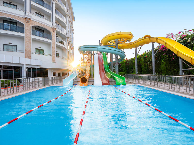 Vybavenie: Moderný luxusný hotel s veľkým bazénom, tobogánmi (otvorené v stanovených časoch/podľa priaznivého počasia), slnečnou terasou a barom pri bazéne/pláži. Slnečníky a ležadlá sú k dispozícii pri bazéne a na pláži. Hotel ponúka vstupnú halu, recepciu, Wi-Fi pripojenie v celom objekte a lobby bar. K dispozícii je hlavná reštaurácia, dve à la carte reštaurácie (turecká a talianska; rezervácia nutná), cukráreň, bistro, obchody a kaderníctvo. Oficiálne hodnotenie: 5 hviezdičiek, 496 izieb, výťahy.