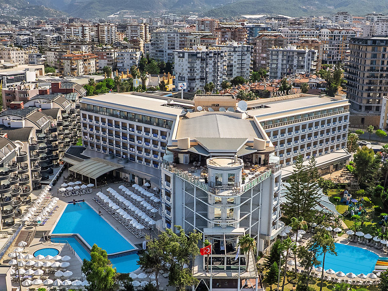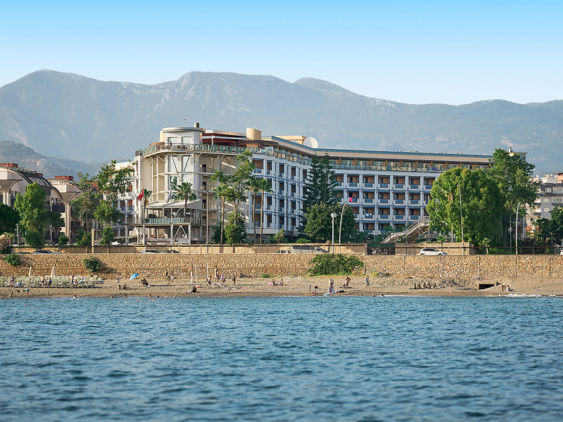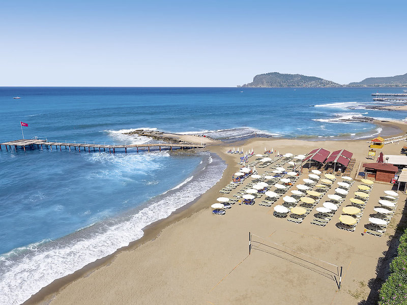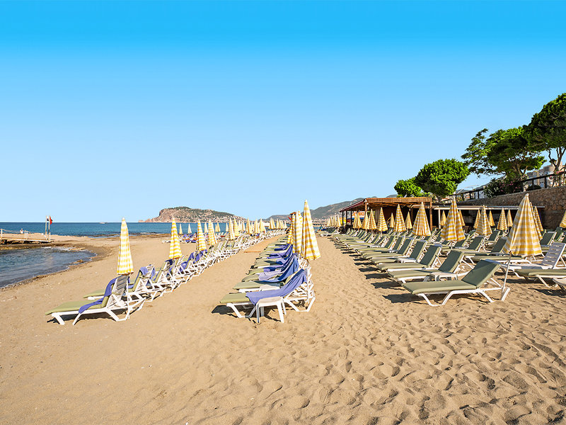 Lage: Durch die Küstenstraße vom langen Strand getrennt (Sand/Kies; Unterführung vorhanden). Einige Geschäfte in der Umgebung des Hotels. Bis zum Zentrum von Alanya mit Restaurants, Bars, Einkaufs- und Unterhaltungsmöglichkeiten ca. 4 km (regelmäßiger Shuttleservice).