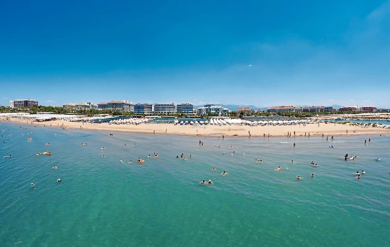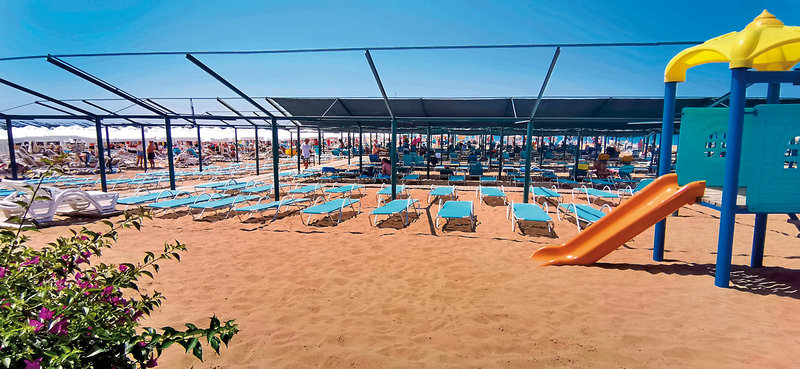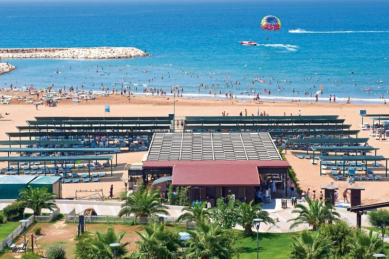 - Sandstrand: flach abfallend, von der Anlage getrennt durch Promenade, Sonnenschirme, Liegen, Strandtuch/Badetuch, Strandservice (ca. 1.4.-31.10.), ca.1.4.-31.10.