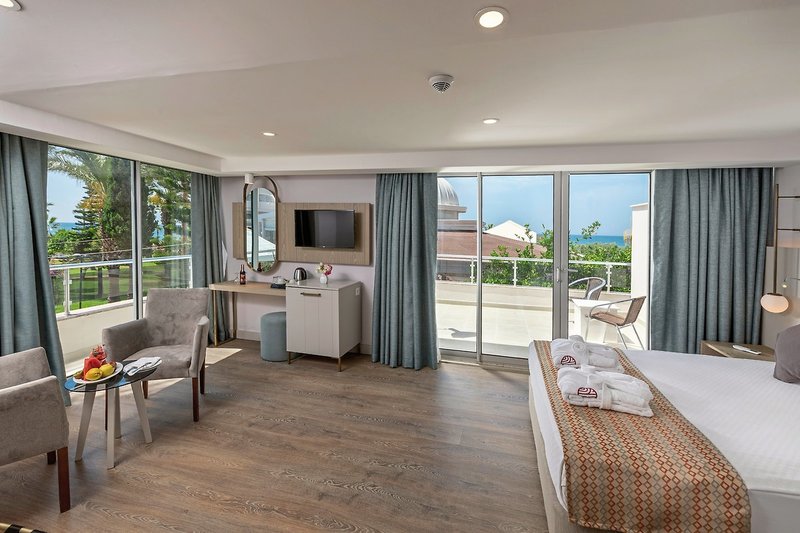 - 21-25 m², dvojlôžková izba, hlavná budova, výhľad na more, 1 kúpeľňa, sprchovací kút, 1 WC, fén, laminátová podlaha, klimatizácia, minibar (pravidelne dopĺňaný), nealkoholické nápoje, voda, trezor, 1 TV (satelitná TV, plochá obrazovka), rýchlovarná kanvica, káva/čaj, balkón