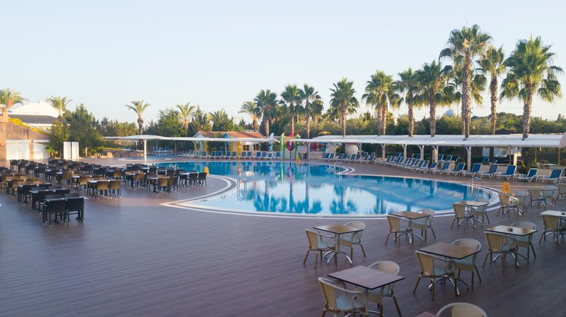 Ausstattung: Die weitläufige Hotelanlage verfügt über zwei Gebäude mit insgesamt 200 Zimmern auf fünf Etagen (Lifts vorhanden). Zu den Hoteleinrichtungen zählen die freundlich gestaltete Empfangshalle mit Rezeption und einladenden Sitzgruppen, Lobbybar und weitere Bars, das Buffetrestaurant mit Terrasse sowie verschiedene Geschäfte und Friseur (jeweils gegen Gebühr). Wi-Fi ist im Hotel inklusive. In der gepflegten, großzügigen Gartenanlage befinden sich das Amphitheater sowie ein großer Süßwasser-Swimmingpool mit separatem Kinderbecken, ein weiterer Pool mit drei Wasserrutschen (stundenweise und wetterbedingt im Ermessen des Hoteliers), Sonnenterrasse und Pool-/Snackbar. Hier sowie am Strand mit Snackbar (nur Softgetränke und Bier inklusive von 10-17 Uhr) sind Liegen und Sonnenschirme und Badetücher für unsere Gäste inklusive.