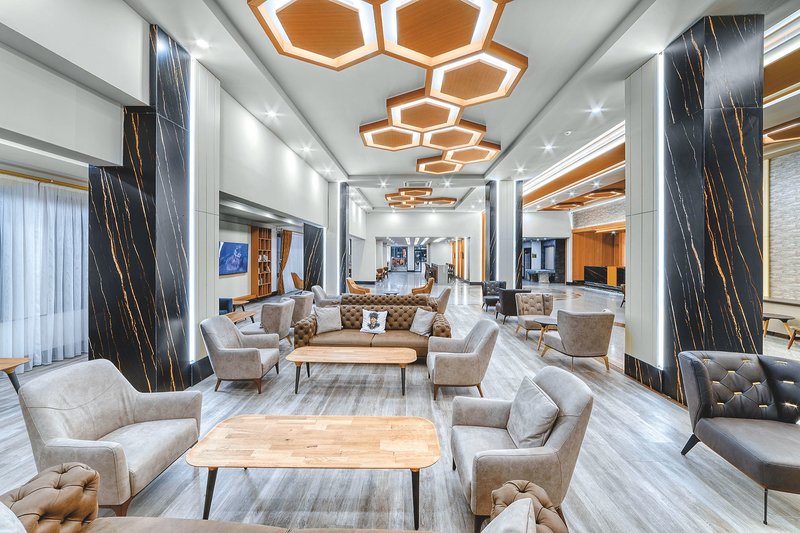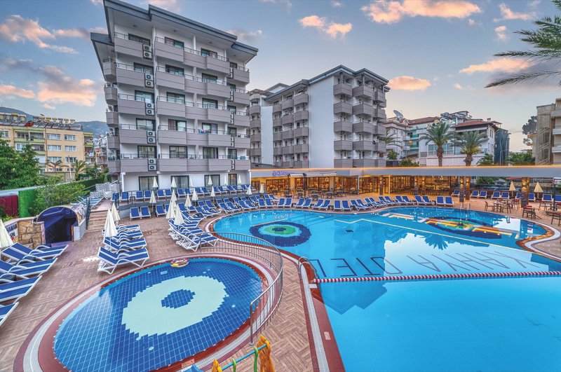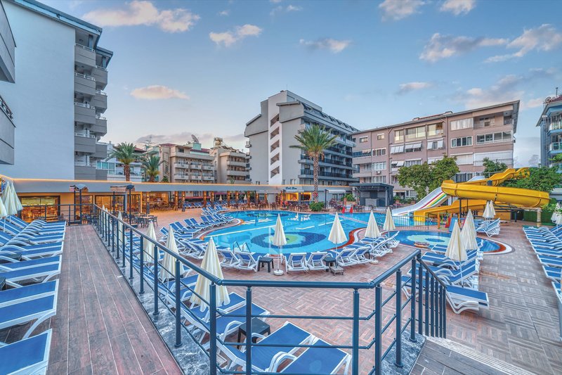 Die Ferienanlage bietet Ihnen 246 Zimmer, die sich auf drei Gebäude mit jeweils fünf Etagen verteilen. Zu den Annehmlichkeiten gehören die Empfangshalle mit Rezeption, Sitzgruppen und Lobbybar sowie Lifts in allen Gebäuden, das Hauptrestaurant mit Terrasse, eine Sat.-TV Ecke, ein Friseur und ein Hallenbad. Wi-Fi ist im ganzen Hotelbereich inklusive. Im gepflegten Außenbereich ist der Swimmingpool (kühl- und im Winter auch heizbar) mit zwei Wasserrutschen (stundenweise) und separatem Kinderbecken, eine Pool-/Snackbar und die Sonnenterrasse. Hier sind Liegen und Sonnenschirme inklusive. Am Strand sind Liegen, Schirme und Auflagen gebührenpflichtig.