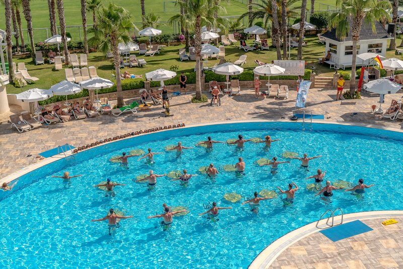 Ausstattung: Garten, Pool, Kinderpool, Wasserrutsche. Liegen, Schirme, Auflagen, Handtücher am Pool und am Strand (geg. Geb.), Pool-/Snackbar. Empfangshalle, Rezeption, Lobby-Bar, Lounge. Restaurant (Buffet & à la carte) mit italienischen und mediterranen Speisen, Terrasse, Minimarkt, Shop, Friseur, Diskothek, Kino, Parkplatz (geg. Geb.). 244 Zimmer, 7 Etagen, 3 Lifte.