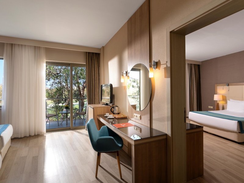 - Family Room with 2 Bedrooms (FZX1), Familienzimmer, Landseite, Gartenblick, ca. 34 - 35 m², Gesamtanzahl der Räume in diesem Zimmertyp: 2, Aufteilung wie folgt: kombiniertes Wohn-/Schlafzimmer, 1 Schlafzimmer, Klimaanlage: ohne Gebühr, zentral gesteuert, Heizung: zentral gesteuert, Fußboden: Laminat, Safe: ohne Gebühr, Minibar: ohne Gebühr, Softdrinks, Wasser, Minibarauffüllung: täglich, Telefon, Internet: WLAN/WiFi: ohne Gebühr, Fernseher: deutsches Programm, Sat-TV, Roomservice: gegen Gebühr, Badewanne oder Dusche, WC, Föhn, Balkon
