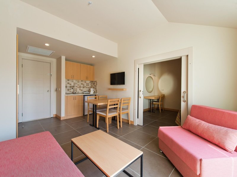 - 2 Bedroom Standard Appartement (APX2), Appartement, Poolseite, Gartenseite, Poolblick, Gartenblick, ca. 62 m², letzte Komplettrenovierung 2015, letzte Teilrenovierung 2015, Gesamtanzahl der Räume in diesem Zimmertyp: 3, Aufteilung wie folgt: kombiniertes Wohn-/Schlafzimmer, Kinderzimmer, 1 Schlafzimmer, 2 Einzelbetten (90x1,9cm), 1 Doppelbett (2x1,55cm), 1 Schlafsofa, Babybett: ohne Gebühr, Anfrage & Reservierung nicht notwendig, Klimaanlage: ohne Gebühr, saisonabhängig, kalt, warm, Fußboden: Parkett, Safe: ohne Gebühr, Sofa, Küche, Kühlschrank: ohne Gebühr, Wasserkocher, Telefon, Internet: WLAN/WiFi: gegen Gebühr, Fernseher: im Wohnbereich, deutsches Programm, Roomservice: täglich 11:00 Uhr - 23:00 Uhr, gegen Gebühr, Reinigungsservice: täglich 09:00 Uhr - 16:00 Uhr, ohne Gebühr, Badewanne oder Dusche, WC, Balkon: mit Sitzgelegenheit, Balkon oder Terrasse, Terrasse