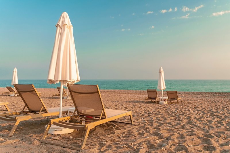 - Piesočnato-kamienková pláž: mierne sa zvažujúca, časť komplexu, dĺžka cca 200 m, oddelená od komplexu cestou, k dispozícii podchod/most, slnečníky, ležadlá, cabaña (za poplatok)