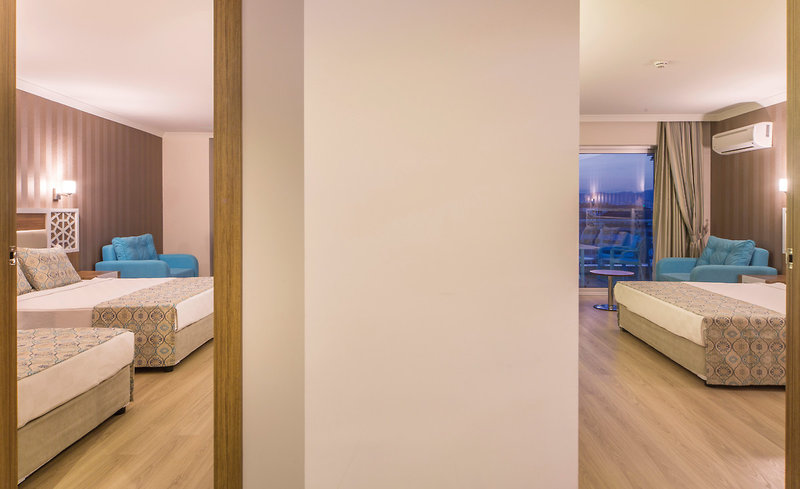 - 71-80 qm, Familien, mit Verbindungstür, 2 separate Schlafzimmer, separater Wohnraum, Einzelbett, 2 Doppelbetten, 2 Bäder, Dusche, WC, Haartrockner, Laminatboden, Klimaanlage, individuell regulierbar, Minibar, Auffüllung regelmäßig, Mineralwasser, Wasser, Safe, TV (Sat-TV), Wasserkocher, Balkon