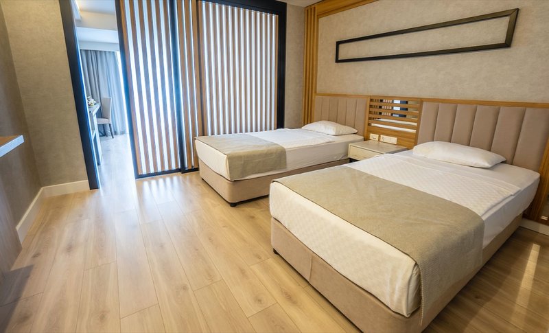 Rodinné izby: Izby s rozlohou približne 36-40 m2 s podobným vybavením pozostávajú z dvoch samostatných spální so spojovacími dverami a sú na strane pozemku (DF2).