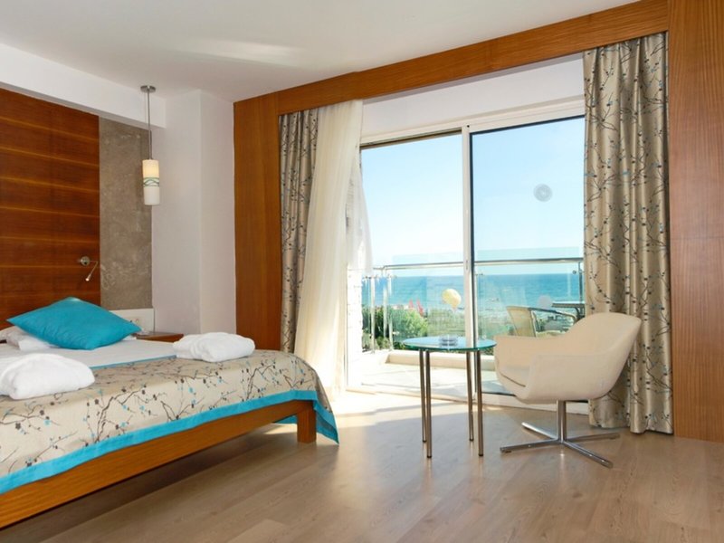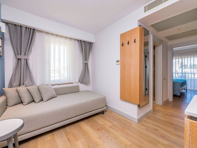 - Suite Direct Sea View Room (SUM1), Meerseite, Meerblick, ca. 46 m², letzte Komplettrenovierung 2013, letzte Teilrenovierung 2020, Gesamtanzahl der Räume in diesem Zimmertyp: 2, Aufteilung wie folgt: bestehend aus 2 Doppelzimmern mit Verbindungstür, kombiniertes Wohn-/Schlafzimmer, 1 Schlafzimmer, 1 Doppelbett (200x200cm), 1 Schlafsofa (160x82cm), Babybett, Klimaanlage: individuell regelbar, Fußboden: Laminat, Safe: ohne Gebühr, Sofa, Minibar: Softdrinks, Wasser, Minibarauffüllung: täglich, Telefon, Internet: WLAN/WiFi: ohne Gebühr, Fernseher: Flatscreen, im Wohnbereich, im Schlafzimmer, deutsches Programm, Sat-TV, Dusche, WC, Bademantel: ohne Gebühr, Slipper: ohne Gebühr, Föhn, Kosmetikspiegel, Balkon