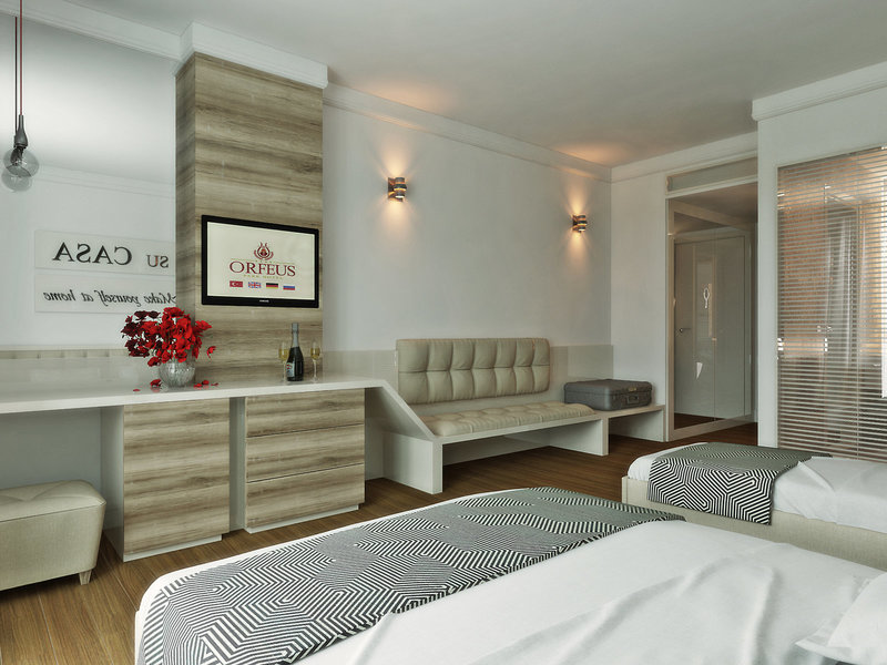Čo vás čaká: Hotel je postavený a zariadený v modernom štýle. So sesterským hotelom Orfeus Park je prepojený spojovacím priechodom pod ulicou, ktorý je tiež možné využiť. Kyvadlová doprava hostí pohodlne odvezie na pláž, ktorá je vzdialená asi 300 m.