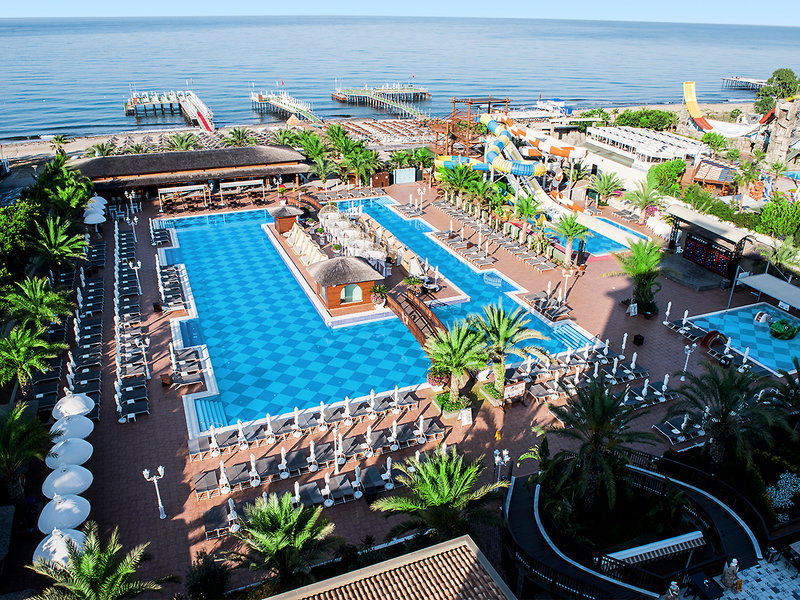 Lage: Direkt am breiten Strand mit hoteleigenem Badesteg (Sand/Kies; vorgelagerte, flache Felsplatten). Das Zentrum von Alanya ist ca. 12 km entfernt.