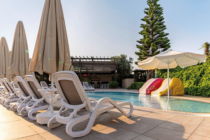 - Sandstrand: flach abfallend, von der Anlage getrennt durch Promenade, Sonnenschirme, Liegen, Strandtuch/Badetuch, Strandservice (ca. 1.3.-30.11.)
