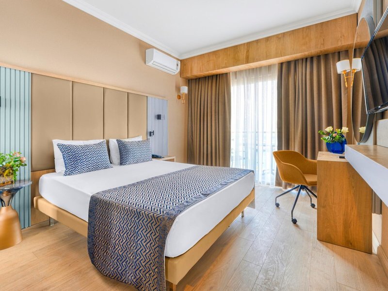 - Standart Sea View (DZM1), Doppelzimmer, Nichtraucherzimmer, im Hauptgebäude, Meerblick, ca. 20 - 24 m², letzte Komplettrenovierung 2023, Gesamtanzahl der Räume in diesem Zimmertyp: 1, Aufteilung wie folgt: kombiniertes Wohn-/Schlafzimmer, 1 Doppelbett, 1 Schlafsofa, Klimaanlage: ohne Gebühr, saisonabhängig; wetterabhängig, individuell regelbar, kalt, warm, Fußboden: Laminat, Safe: ohne Gebühr, Sofa, Bügeleisen, Bügelbrett, Nespressomaschine, Kaffee-/Teezubereiter, Minibar: gegen Gebühr, Softdrinks: gegen Gebühr, Wasser: ohne Gebühr, alkoholische Getränke: gegen Gebühr, Snacks: gegen Gebühr, Minibarauffüllung: täglich 08:00 Uhr - 16:00 Uhr, Telefon, Internet: WLAN/WiFi: ohne Gebühr, Fernseher, Roomservice: täglich 24 Stunden, gegen Gebühr, Reinigungsservice: täglich 08:00 Uhr - 16:00 Uhr, ohne Gebühr, Dusche, WC, Bademantel: ohne Gebühr, Slipper: ohne Gebühr, Föhn, Kosmetikspiegel, Balkon: mit Sitzgelegenheit