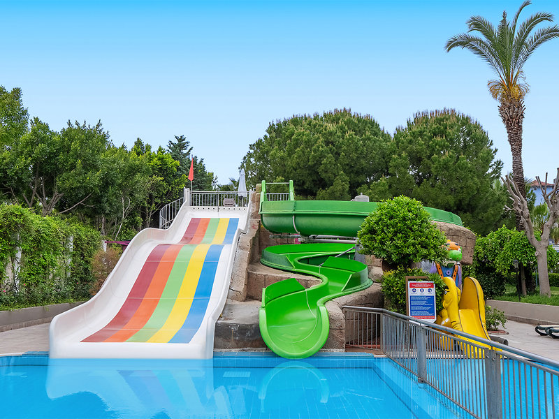 Ausstattung: Ferienanlage der gehobenen Mittelklasse, bestehend aus 1 Haupthaus und 1 Wohngebäuden. Gartenanlage, 3 Pools, Rutschen (stdw.), Sonnenterrassen. Liegen (integrierte Auflagen), Schirme, Badetücher (Badetuchwechsel geg. Geb.). Poolbar, Snack-/Strandbar (Mai-Oktober, wetterabh.). Empfangshalle, WLAN in der Lobby, am Pool und am Strand inkl. Lobbybar, Restaurant mit Terrasse, 2 À-la-carte-Restaurants (2x pro Woche geöffnet vom 01.06.-30.09.), Patisserie, Bars, Geschäfte, Friseur, Diskothek. Landeskat.: 5 Sterne, 265 Zimmer, 4 Etg., 4 Lifte.