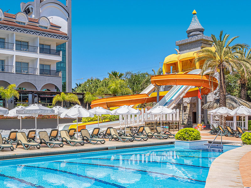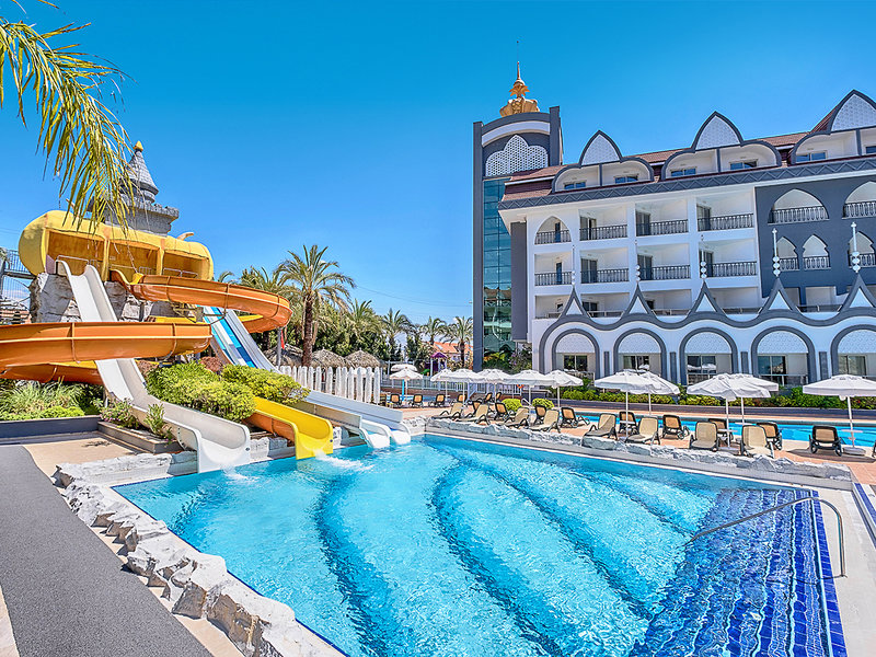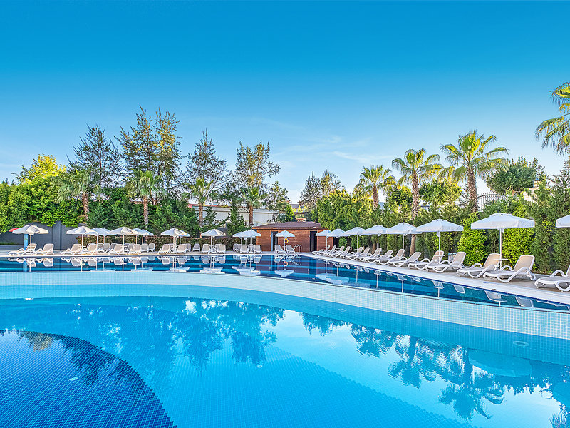 Ausstattung: Im Außenbereich Sonnenterrasse, Poollandschaft, 3 Pools, Rutschenpool (stdw.), Pool-/Strandbar (April-Oktober). Schirme, Liegen (integr. Auflagen), Badetücher. Außeneinrichtungen wetterabhängig geöffnet. Elegante Empfangshalle, Rezeption, Lobbybar, WLAN im gesamten Hotel inklusive, Hauptrest. mit Terrasse, À-la-carte-Rest. (italienisch (April-Oktober), Fisch (ganzjährig), türkisch (ganzjährig); gegen Gebühr; Reserv.), 5 Bars, Patisserie, türkisches Café, Geschäfte, Amphitheater, Arztservice (stdw., gegen Gebühr), Spielsalon, Diskothek. Landeskat.: 5 St., 315 Zi., 4 Etg., 5 Lifte.