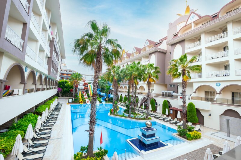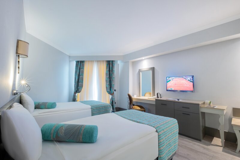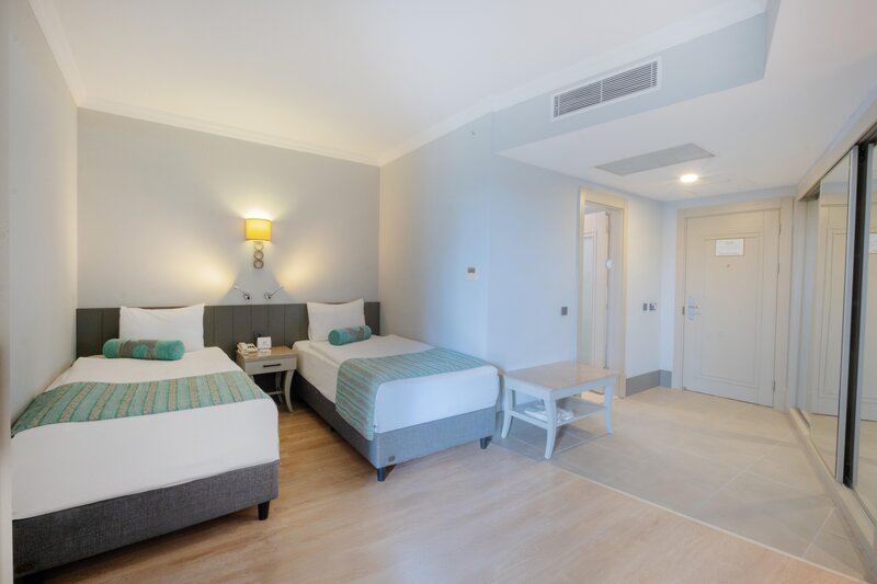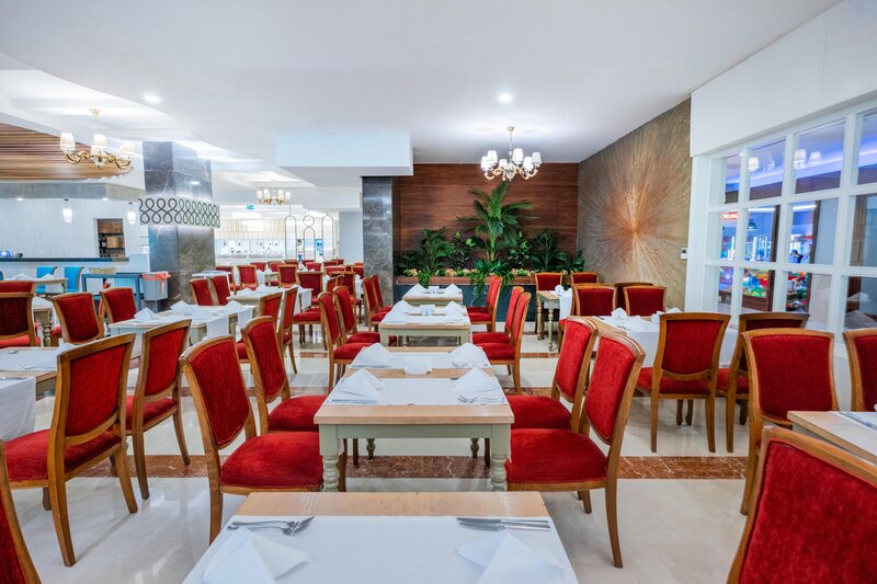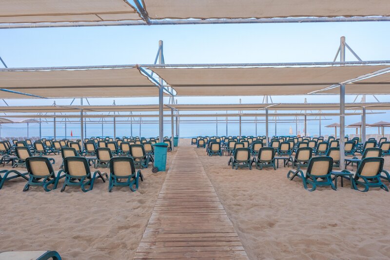 Ausstattung: Garten, Pool, Kinderpool, Wasserrutsche. Handtücher am Pool und am Strand (geg. Geb.), Liegen, Schirme, Auflagen am Pool (geg. Geb.), Beach-Bar, Pool-/Snackbar. Empfangshalle, Rezeption, Lobby-Bar, TV-Lounge. Restaurant (Buffet & à la carte) mit nationalen, italienischen und mediterranen Speisen, Terrasse, Minimarkt, Shop, Friseur, Diskothek. 513 Zimmer, 4 Etagen.