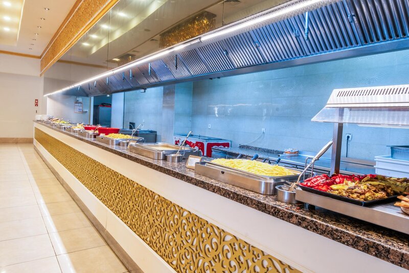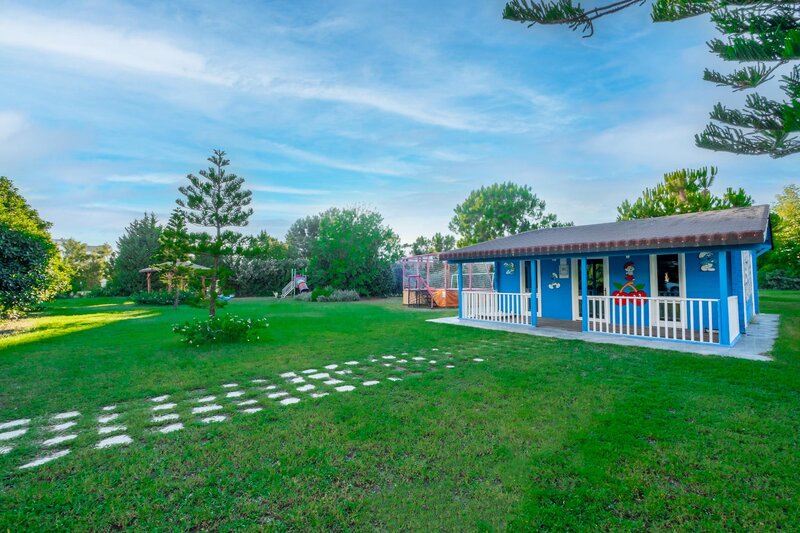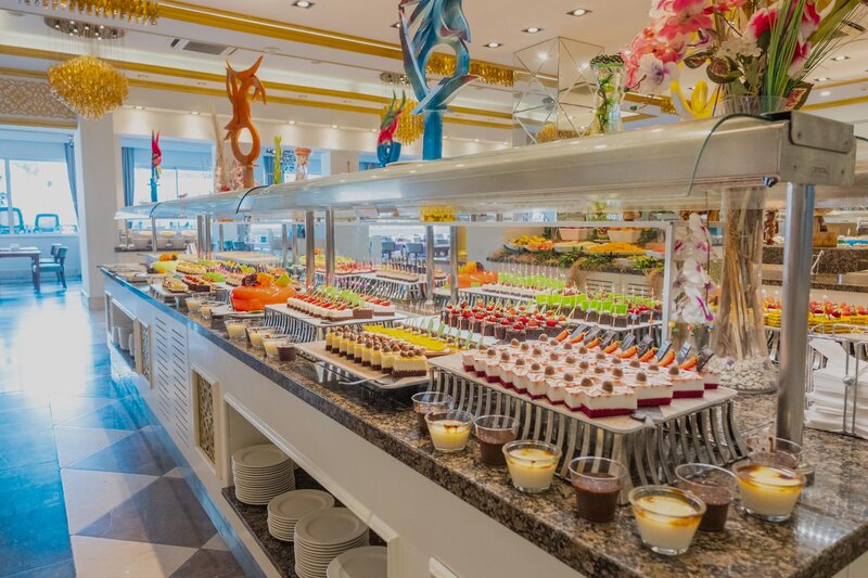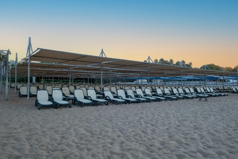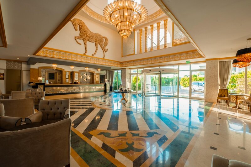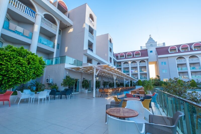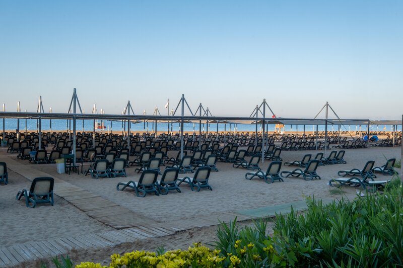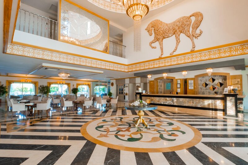 Ausstattung: Garten, 2 Pools, Kinderpool, Wasserrutsche. Liegen, Schirme, Handtücher am Pool und am Strand (geg. Geb.), Pool-/Snackbar. Empfangshalle, Rezeption, Lobby-Bar, TV-Lounge. Restaurant (Buffet & à la carte) mit nationalen, italienischen und mediterranen Speisen, Terrasse, 5 Bars, Cafeteria, Minimarkt, Shop, Friseur, Diskothek, Parkplatz (geg. Geb.). 4 Etagen, 4 Lifte.