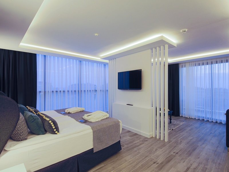 - Suite Room (SUX1), Suite, Nichtraucherzimmer, Mindestalter im Zimmer: 16 Jahre, im Hauptgebäude, Poolblick, Gartenblick, Blick auf Landblick, ca. 30 m², Gesamtanzahl der Räume in diesem Zimmertyp: 1, Aufteilung wie folgt: kombiniertes Wohn-/Schlafzimmer, 1 Schlafzimmer, 1 Doppelbett (180x200cm), Klimaanlage: ohne Gebühr, bei All Inclusive inklusive, Januar - Dezember, zentral gesteuert, kalt, warm, Fußboden: Laminat, Safe: ohne Gebühr, bei All Inclusive inklusive, Sitzecke, Schreibtisch, Kaffee-/Teezubereiter, Wasserkocher, Minibar: ohne Gebühr, bei All Inclusive inklusive, Softdrinks: bei All Inclusive inklusive, Wasser: ohne Gebühr, bei All Inclusive inklusive, alkoholische Getränke: ohne Gebühr, bei All Inclusive inklusive, Minibarauffüllung: täglich 12:00 Uhr - 16:00 Uhr, Telefon, Internet: WLAN/WiFi: ohne Gebühr, bei All Inclusive inklusive, Fernseher: deutsches Programm, Sat-TV, Roomservice: täglich 24 Stunden, gegen Gebühr, Reinigungsservice: 08:00 Uhr - 16:00 Uhr, ohne Gebühr, bei All Inclusive inklusive, Dusche, Whirlpool, WC, Bademantel: ohne Gebühr, bei All Inclusive inklusive, Slipper: ohne Gebühr, bei All Inclusive inklusive, Föhn, Kosmetikspiegel, Balkon