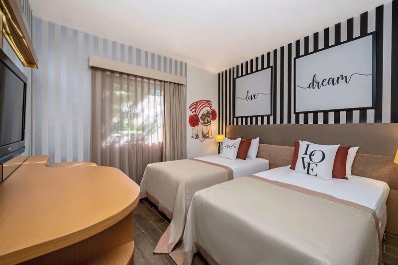 - 36-40 qm, Familien, mit Verbindungstür, Poolblick, 2 separate Schlafzimmer, 2 Einzelbetten, 1 Doppelbett, Dusche, Badeslipper, Haartrockner, Laminatboden, Klimaanlage, zentral gesteuert, Minibar, Auffüllung regelmäßig, Softdrinks, Mineralwasser, Bier, Wasser, Safe, TV (Sat-TV), Wasserkocher, Kaffee/Tee, Balkon (möbliert)