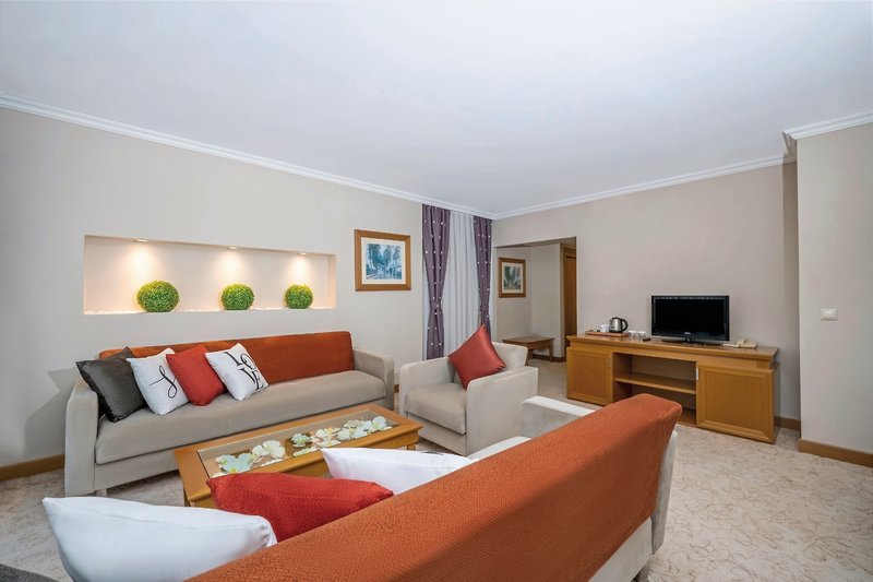 - 51-60 qm, Suite, mit Verbindungstür, Gartenblick, Poolblick, 2 separate Schlafzimmer, separater Wohnraum, Dusche, Badeslipper, Haartrockner, Fliesen, Laminatboden, Klimaanlage, zentral gesteuert, Minibar, Auffüllung regelmäßig, Softdrinks, Mineralwasser, Bier, Wasser, Safe, TV (Sat-TV), Wasserkocher, Kaffee/Tee, Balkon oder Terrasse (möbliert), direkter Poolzugang, Gemeinschaftspool