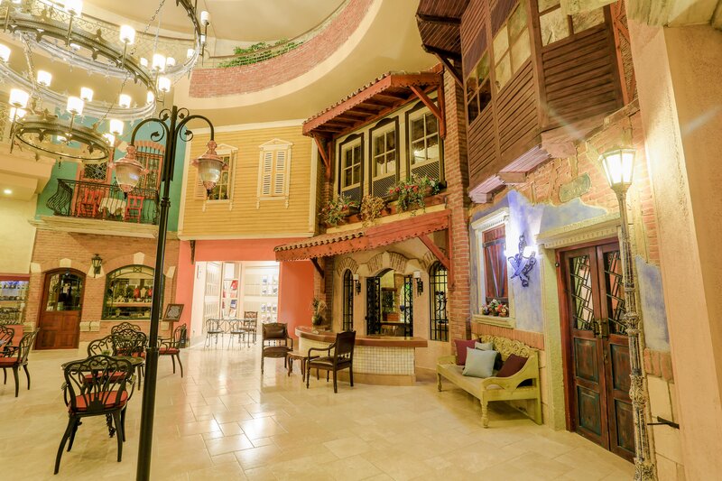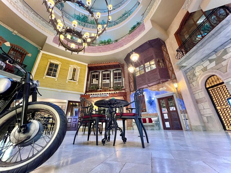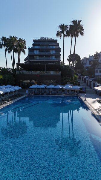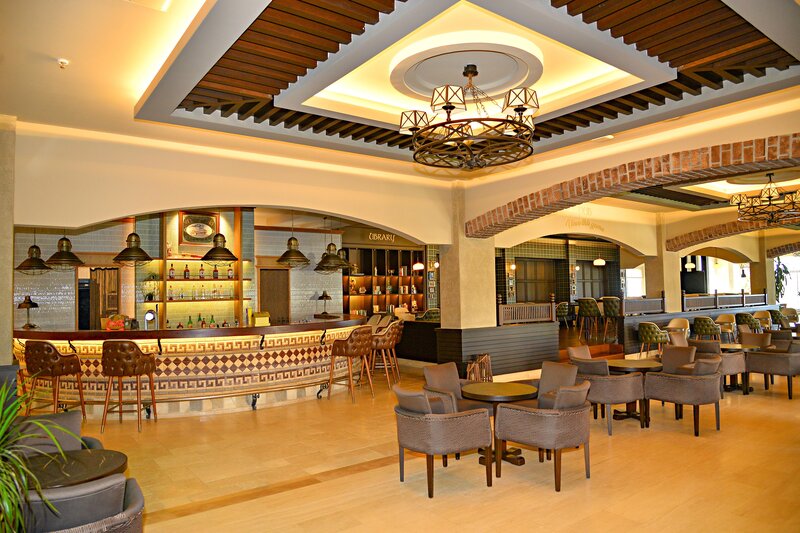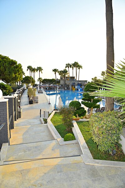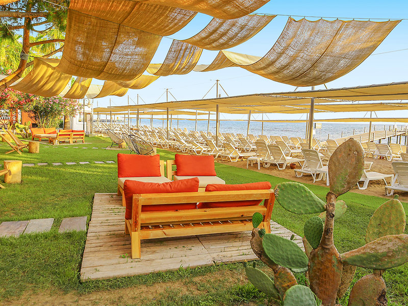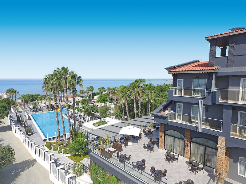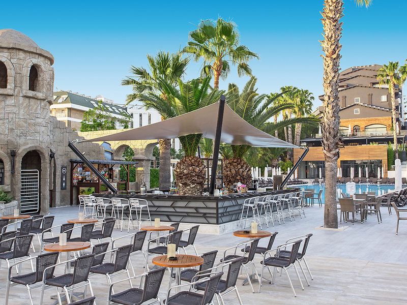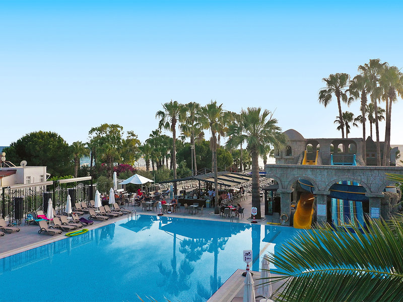 Ausstattung: Ferienhotel der gehobenen Mittelklasse. Gartenanlage mit Swimmingpool, Kinderpool, Sonnenterrassen, 2 Wasserrutschen(stdw./wetterabhängig). Liegen, Schirme, Auflagen, Badetücher. Pool-/Snackbar. Empfangshalle, Rezeption, Lobbybar, WLAN, Aufenthaltsraum, Restaurant mit Terrasse, 2 À-la-carte-Restaurants (Fisch, türkische Küche; Reservierung erforderlich), Geschäfte. Landeskategorie: 5 Sterne, 238 Zimmer, 5 Etagen, 3 Lifte.