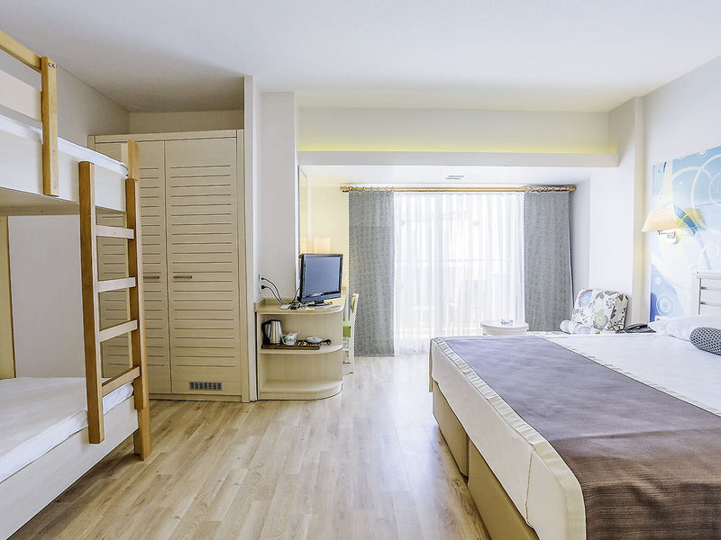 Doppelzimmer Large (DZB, ca. 26 qm), Etagenbett für die Kinder, Klimaanlage (indiv.), Minibar, Telefon, Safe, TV. Dusche, WC, Föhn. Balkon, seitlicher Meerblick. Max. 2E+2K