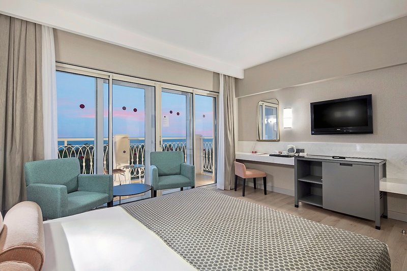 - 21-25 qm, Doppel, Meerblick (seitlich), Doppelbetten (1 Doppel- oder 2 Einzelbetten), Dusche, Bademantel, Haartrockner, Laminatboden, Klimaanlage, (stundenweise), zentral gesteuert, Minibar, Auffüllung regelmäßig, Safe, 1 TV (Sat-TV), Wasserkocher, Kaffee/Tee, Balkon, auch als Doppelzimmer Single mit Kind seitl. Meerblick (DCN) buchbar