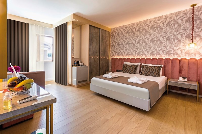 - 41-45 qm, Juniorsuite, Nebengebäude, Poolblick, 1 separates Schlafzimmer, separater Wohnraum, Dusche, WC, Haartrockner, Klimaanlage, zentral gesteuert, Minibar, Auffüllung regelmäßig, Softdrinks, Bier, Wasser, Safe, 1 TV (Sat-TV, Flachbildschirm), Wasserkocher, Kaffee/Tee, Balkon, direkter Poolzugang, Zutritt zur Club-Lounge, Frühstück in der Club-Lounge, Softdrinks in der Club-Lounge, Abends alkoholische Getränke in der Club-Lounge, separater Strandbereich, Aufdeck-Service, Pooltuch, bei Ankunft im Zimmer Obstkorb, Wein, Flasche Sekt, Gebäck