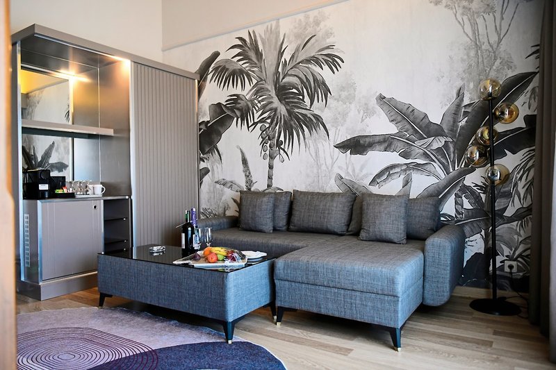 - 41-45 qm, Juniorsuite, Nebengebäude, Poolblick, 1 separates Schlafzimmer, separater Wohnraum, Dusche, WC, Haartrockner, Klimaanlage, zentral gesteuert, ca. 1.6.-15.9., Minibar, Auffüllung regelmäßig, Softdrinks, Bier, Wasser, Safe, 1 TV (Sat-TV, Flachbildschirm), Wasserkocher, Kaffee/Tee, Balkon, direkter Poolzugang, Zutritt zur Club-Lounge, Frühstück in der Club-Lounge, Softdrinks in der Club-Lounge, abends alkoholische Getränke in der Club-Lounge, separater Strandbereich, Aufdeck-Service, Pooltuch, bei Ankunft im Zimmer Obstkorb, Wein, Flasche Sekt, Gebäck