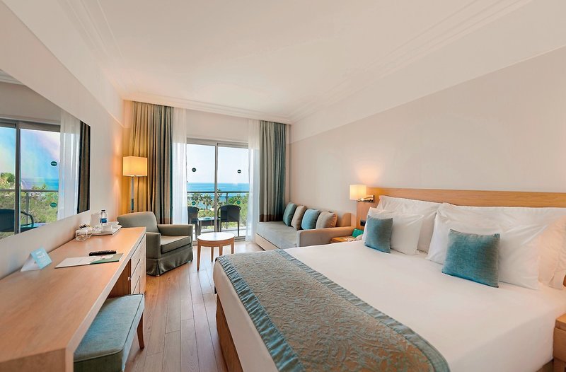 - 26-30 qm, Doppel, Deluxe, Hauptgebäude, Meerblick, 1 Bad, Dusche, WC, Bademantel, Badeslipper, Haartrockner, Klimaanlage, individuell regulierbar, Minibar, Auffüllung täglich, Softdrinks, Bier, Wasser, Safe, TV (Sat-TV), Wasserkocher, Kaffee/Tee, Balkon