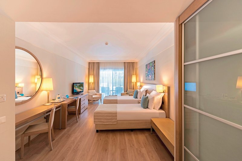 - 46-50 qm, Familien, mit Verbindungstür, Deluxe, Hauptgebäude, Meerblick, 2 separate Schlafzimmer, 1 Bad, Dusche, WC, Bademantel, Badeslipper, Haartrockner, Klimaanlage, individuell regulierbar, Minibar, Auffüllung täglich, Softdrinks, Bier, Wasser, Safe, TV (Sat-TV), Wasserkocher, Kaffee/Tee, Balkon