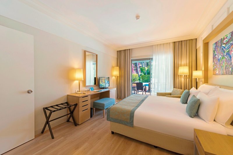 - 46-50 qm, Familien, mit Verbindungstür, Deluxe, Hauptgebäude, Meerblick, 2 separate Schlafzimmer, 1 Bad, Dusche, WC, Bademantel, Badeslipper, Haartrockner, Klimaanlage, individuell regulierbar, Minibar, Auffüllung täglich, Softdrinks, Bier, Wasser, Safe, TV (Sat-TV), Wasserkocher, Kaffee/Tee, Balkon