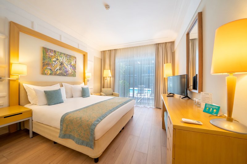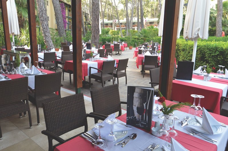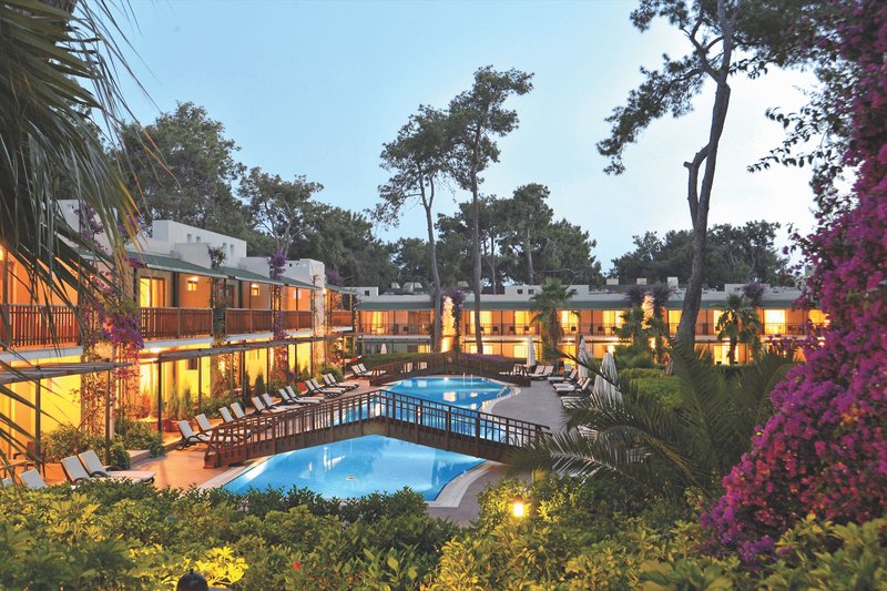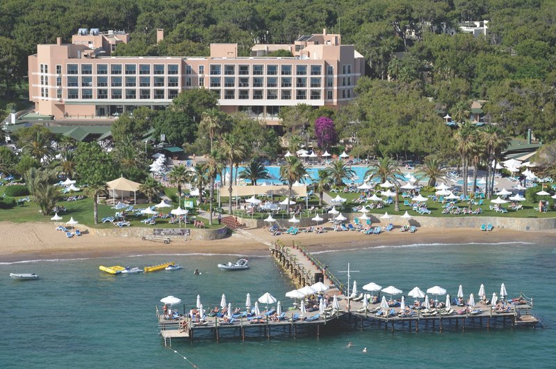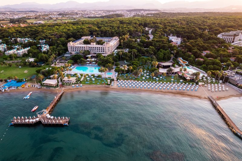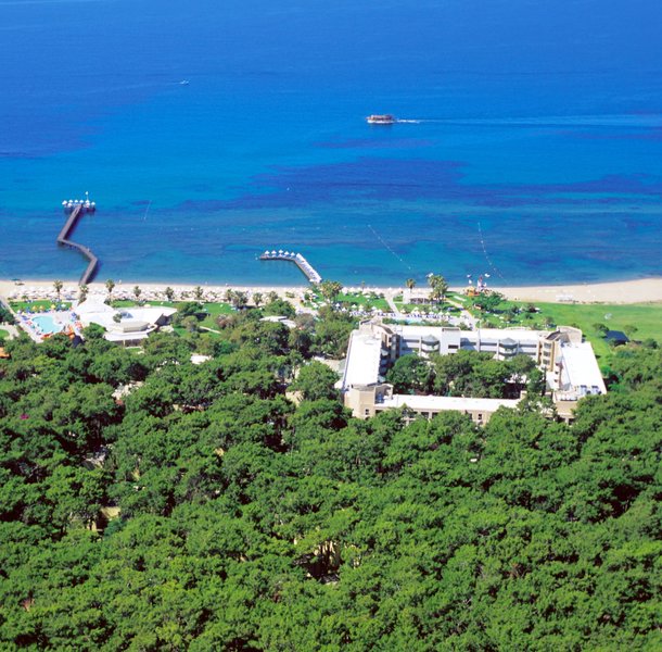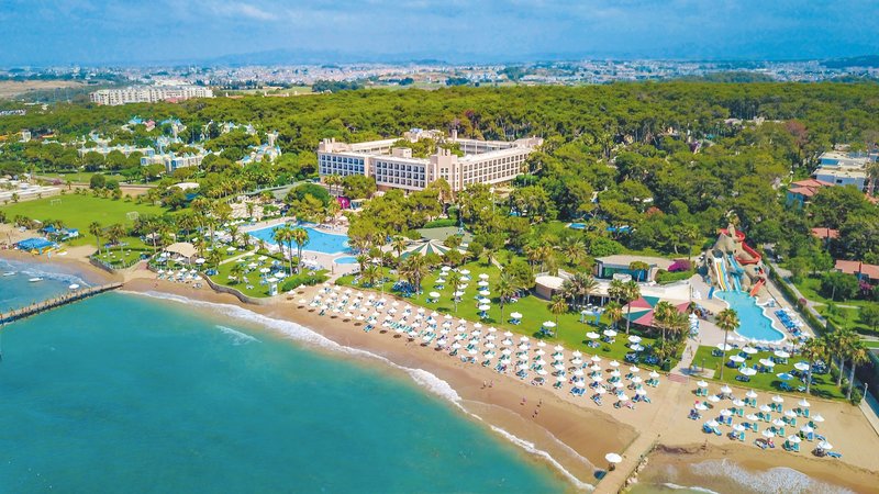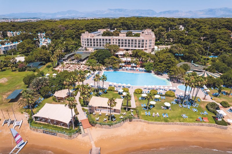 Vybavenie: Tento obľúbený rezort pozostáva zo štvorposchodovej hlavnej budovy postavenej v štýle starého karavanseraja a situovanej na pobreží, ako aj z niekoľkých dvoj- až trojposchodových prístavieb usadených v tieni borovíc (spolu 486 izieb). Medzi mnohé vybavenie pre bezstarostnú dovolenku patrí vstupná hala s recepciou, lobby bar, posedenie a bufetová reštaurácia s kaderníctvom a štýlovými obchodmi (každý za poplatok). K dispozícii je tiež niekoľko reštaurácií à la carte (rezervácia nutná za poplatok), viacero barov, cukráreň, konferenčná miestnosť, wellness a spa centrum a krytý bazén vyhrievaný od 11. apríla do 12. mája. Priestranná vonkajšia časť ponúka sladkovodný bazén so slnečnou terasou a samostatným detským bazénom, relaxačný bazén (pre hostí od 16 rokov), ďalší bazén s tromi tobogánmi (za priaznivého počasia/otvorený v určitých časoch) a snack bar pri bazéne (za priaznivého počasia). Tu, rovnako ako na pláži s plážovým barom (ak to počasie dovolí), sú pre našich hostí zahrnuté ležadlá (bez vankúšov), slnečníky a plážové osušky (raz denne po predložení karty na osušku). Wi-Fi je k dispozícii zadarmo vo vstupnej hale, vo všetkých izbách, pri hlavnom bazéne a v bare Sultan.