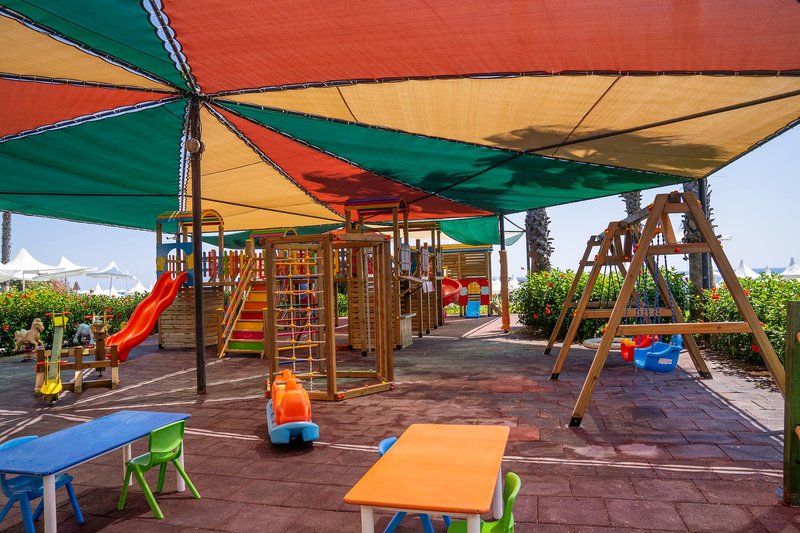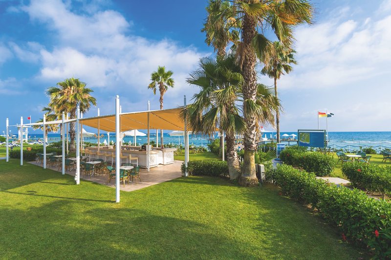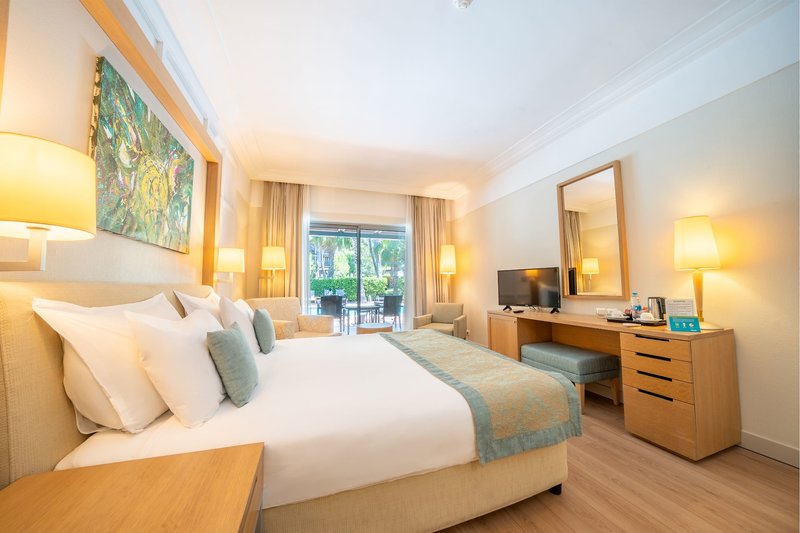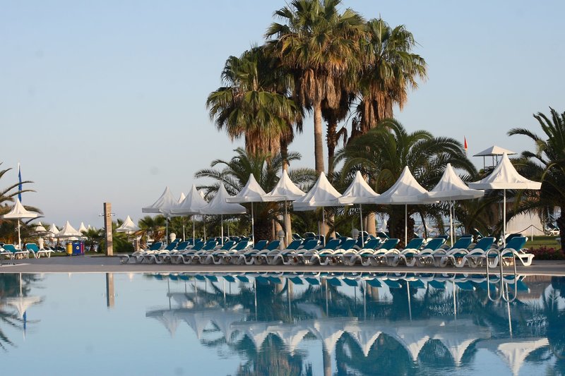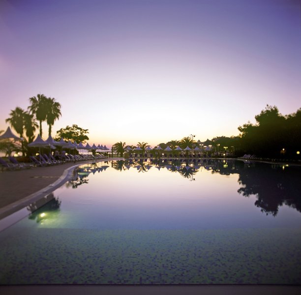 Ausstattung: Die beliebte Ferienanlage besteht aus einem vierstöckigen Hauptgebäude, das im Stil einer alten Karawanserei gebaut wurde und zur Meerseite gelegen ist, sowie diversen zwei- bis dreistöckigen Nebengebäuden, die sich unter schattenspendenden Pinienbäumen verteilen (insgesamt 486 Zimmer). Zu den vielen Annehmlichkeiten für unbeschwerte Urlaubstage zählen die Empfangshalle mit Rezeption, Lobbybar, Sitzgruppen und das Buffetrestaurant mit Terrassenbereich.Gameland, Friseur und schicke Geschäfte jeweils gegen Gebühr. Diverse À-la-carte-Restaurants (mit Reservierung, gegen Gebühr), mehrere Bars, Patisserie, Konferenzraum sowie das Wellness- und Spa-Center und ein Hallenbad vom 11.4.-12.5. beheizt. In der großzügigen Außenanlage befindet sich der Süßwasser-Swimmingpool mit Sonnenterrasse und separatem Kinderbecken, ein Ruhepool (ab 16 Jahren), ein weiterer Pool mit drei Wasserrutschen (wetterbedingt/stundenweise) und die Pool-/Snackbar (wetterbedingt). Hier sowie am Strand mit Beachbar (wetterbedingt) sind Liegen (ohne Auflagen), Sonnenschirme und Badetücher (einmal täglich gegen Vorlage einer Handtuchkarte) für unsere Gäste inklusive. Wi-Fi wird in der Lobby und in allen Zimmern, am Hauptpool und an der Sultan Bar kostenfrei angeboten.