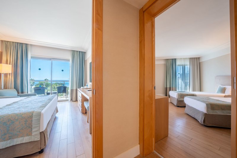 Deluxe Familienzimmer: Sie verfügen bei gleicher Lage und Ausstattung wie die Deluxezimmer im Hauptgebäude, verfügen über ein Bad mit Dusche/WC, Laminatboden, bestehen aus zwei Schlafräumen (eins mit French und eins mit Twinbetten) mit Verbindungstür sowie mit Balkon und Meerblick (2DS)